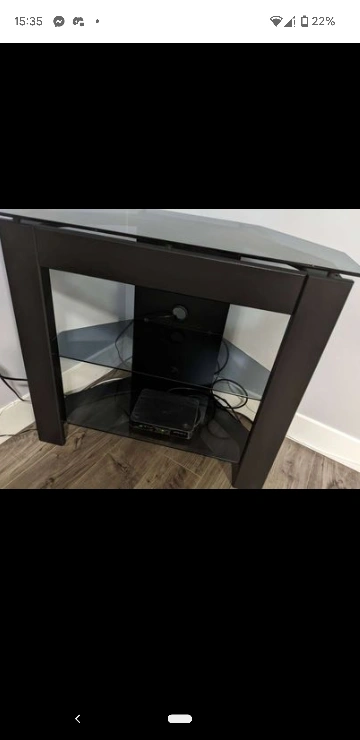 Black corner TV stand with glass shelves. It has a hole for cords in the back.