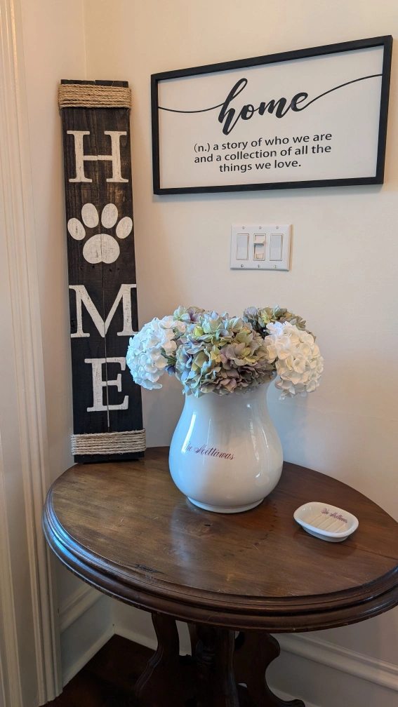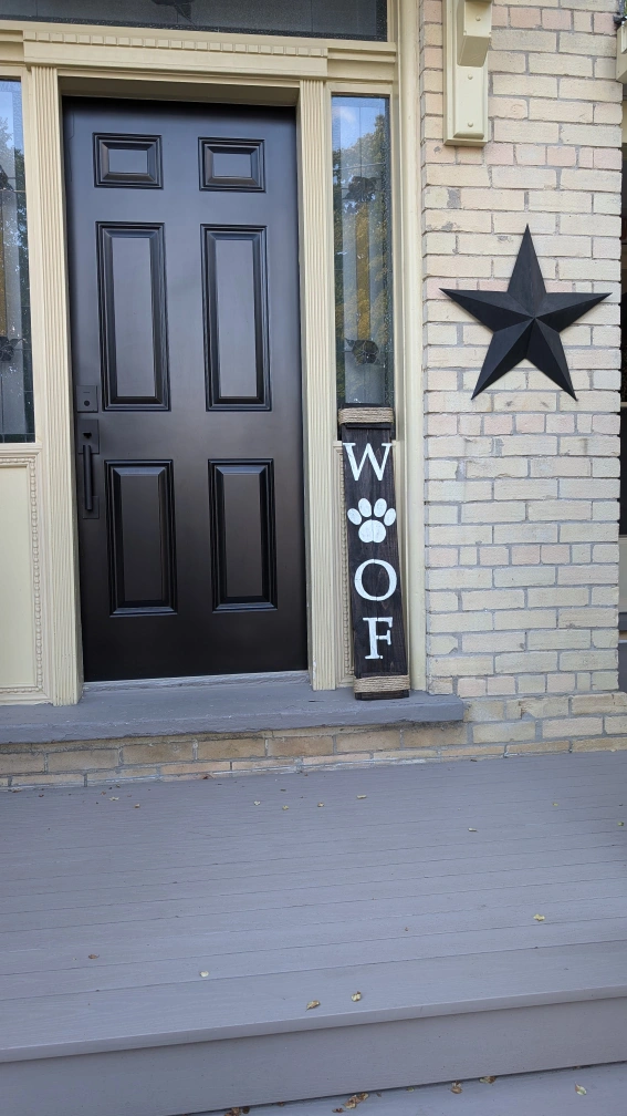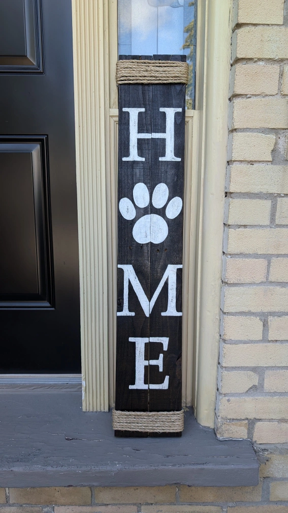 A "Home" sign with a paw print on the front and "Woof" with a paw print on the back. Perfect decoration for a dog lover's home outside or inside. Made of solid wood and weighs about 5 lbs. Thanks for checking it out!
