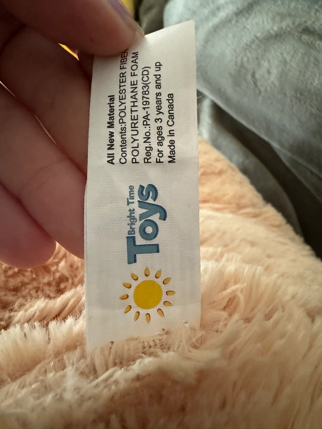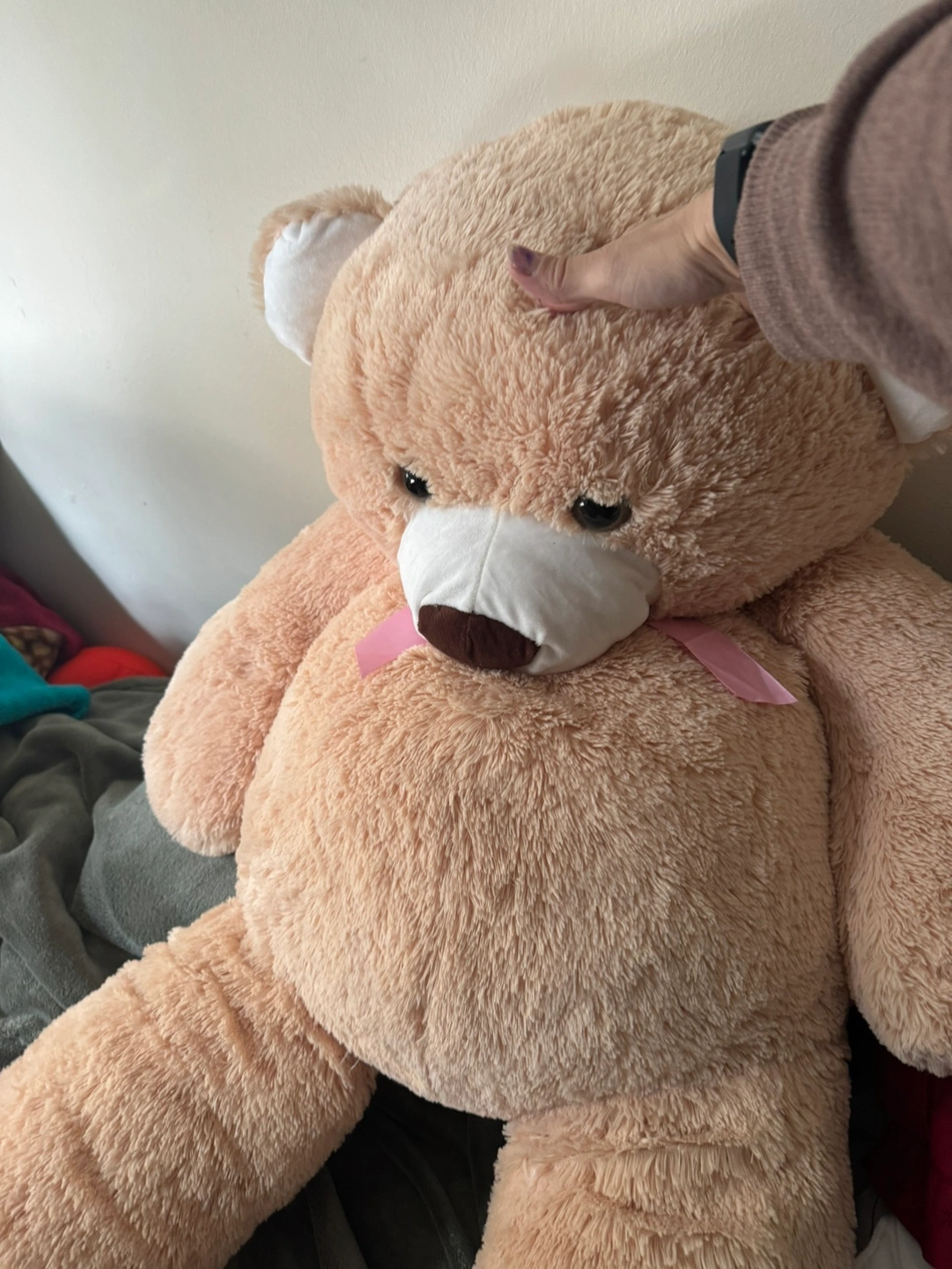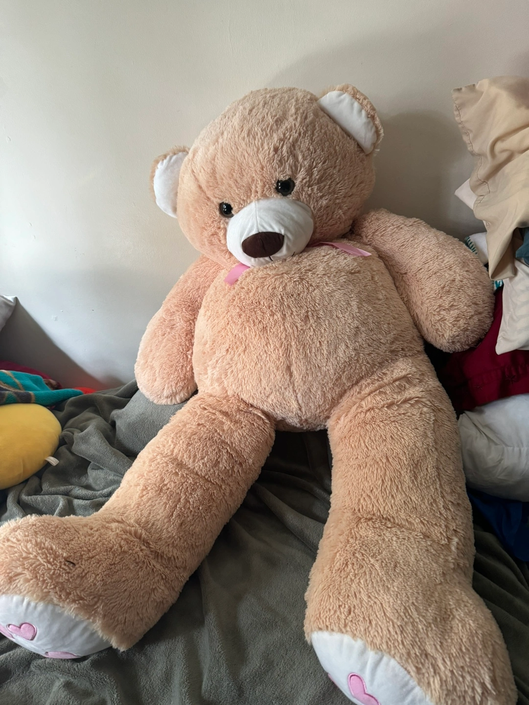 This is a large plush bear in beige with pink hearts. It has a pink ribbon tied around its neck and white paws with pink hearts. It has a tag that says Bright Time Toys. It’s about 4 feet tall.