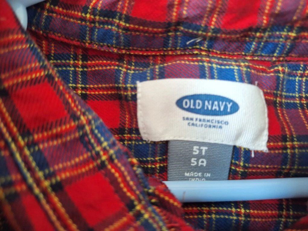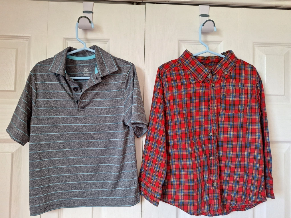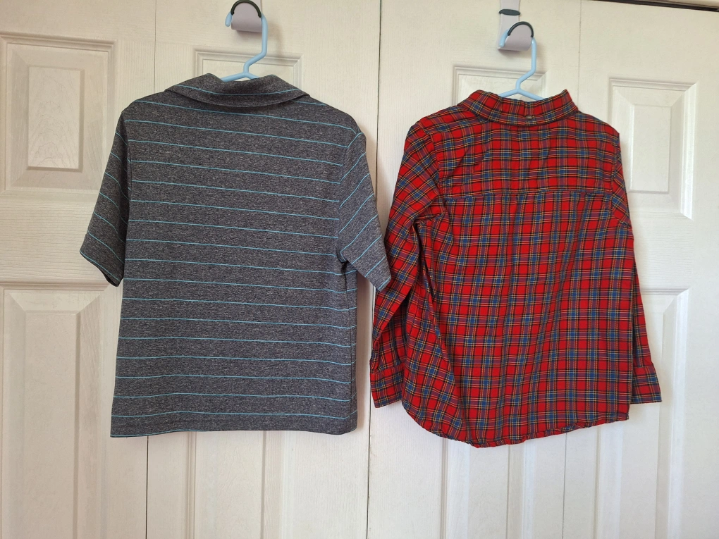 527A red plaid long sleeve shirt in size 5 and grey striped short sleeve shirt in size 5T. Both barely worn, in great shape. $5 each * Check out my other ads for great deals on clothing and more*