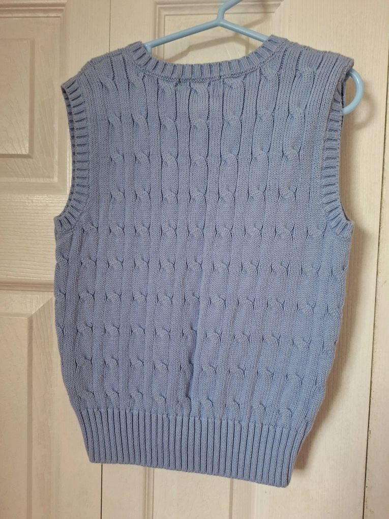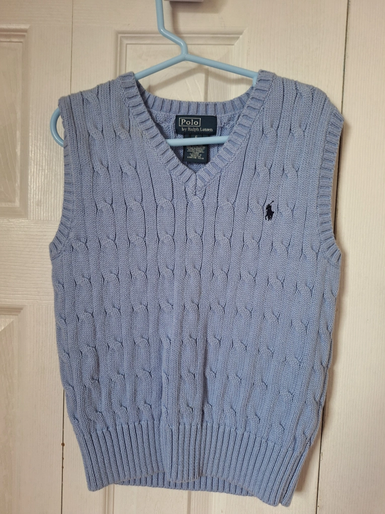 527This is a blue cable knit vest from Polo Ralph Lauren. It features a V-neck and a small Polo logo on the left side of the chest. Size 6. The vest is in excellent condition as my son never wore it. * Check out my other ads for great deals on clothing and more*
