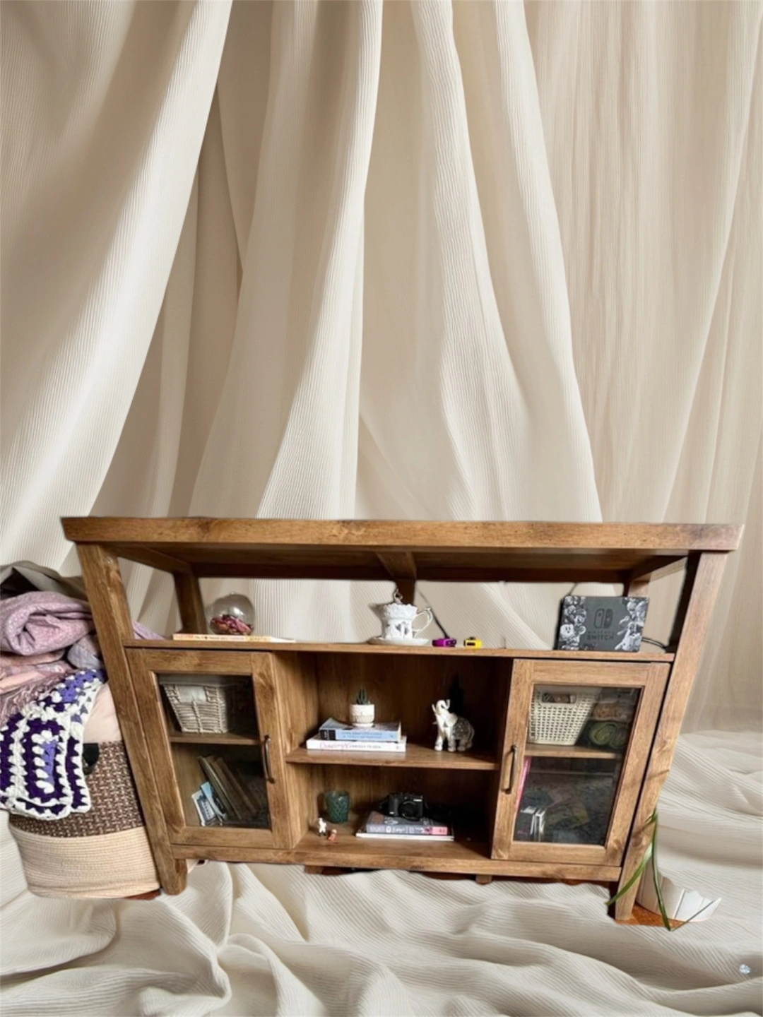 Wood TV stand with storage space. It has two doors with glass panes and a shelf behind each door. It also has an open shelf on the top.