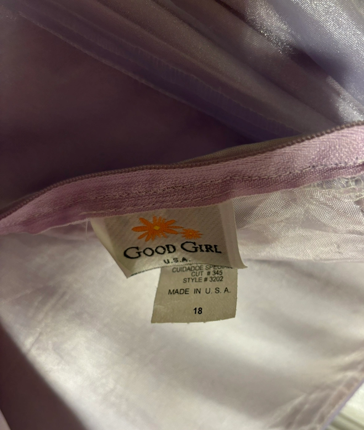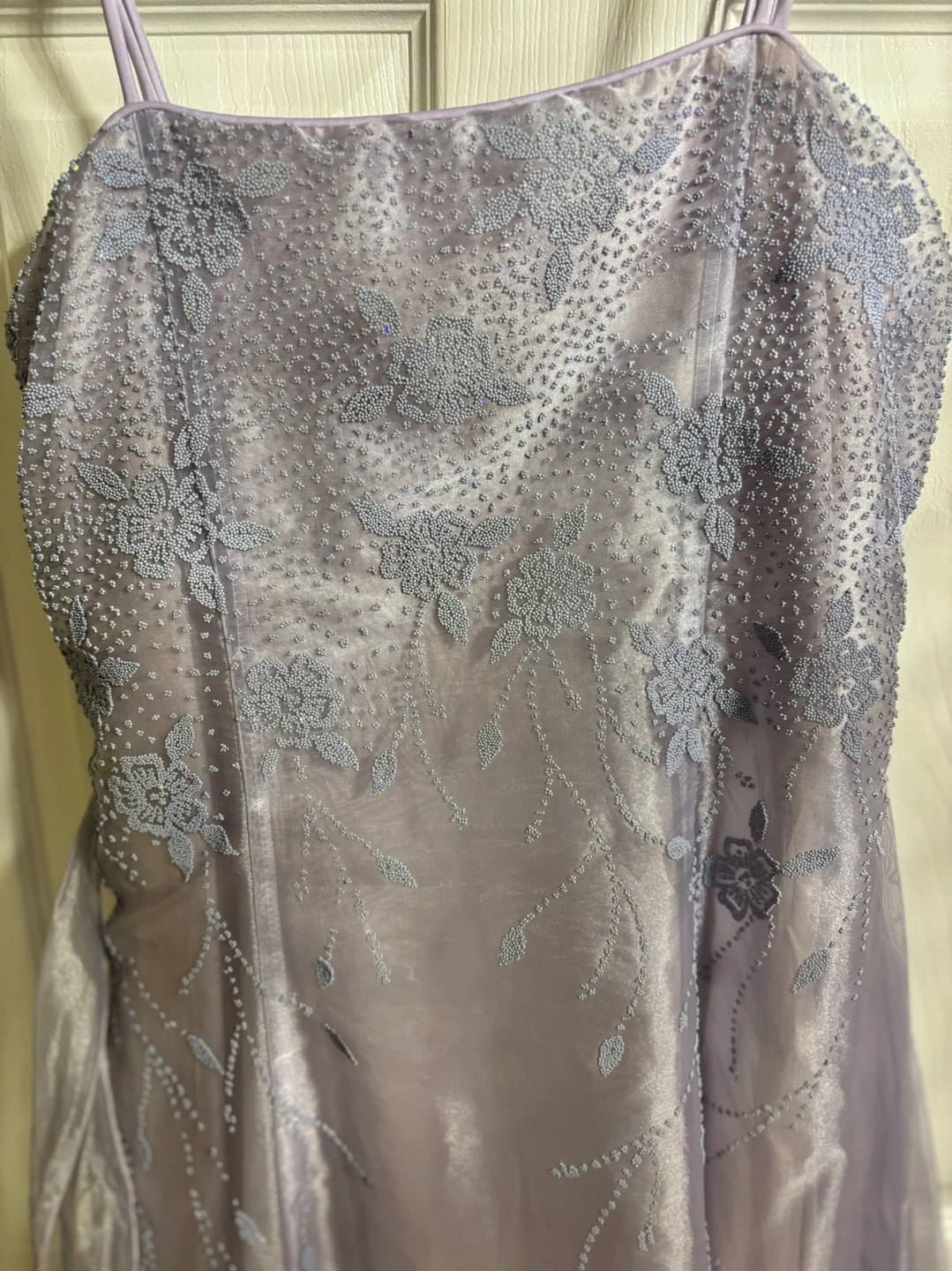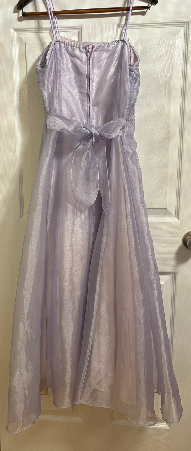 Lavender beaded dress by Good Girl, size 18. The dress has a sweetheart neckline, thin adjustable straps and a back zipper. The dress is made of a sheer fabric with a satin underlay. The dress is adorned with floral beading. The dress has a bow in the back.