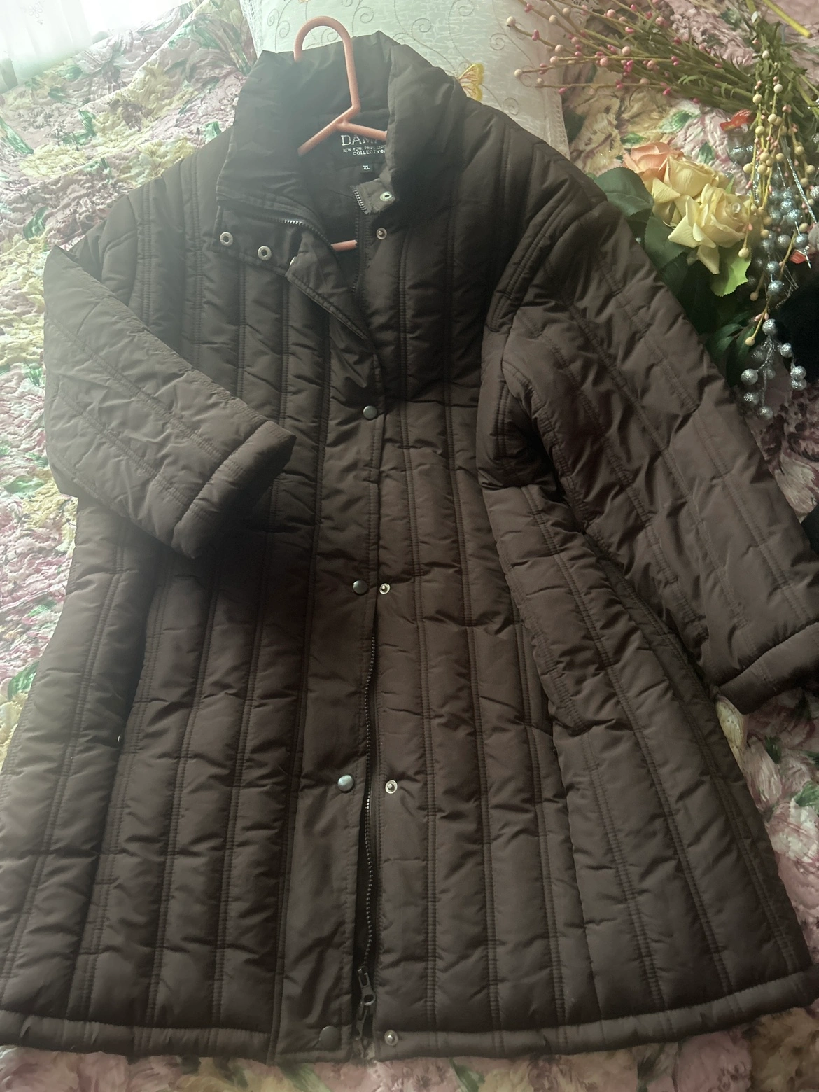This is a brown quilted winter coat with a zipper and button closure. It has a high collar and long sleeves. The coat is in good condition.