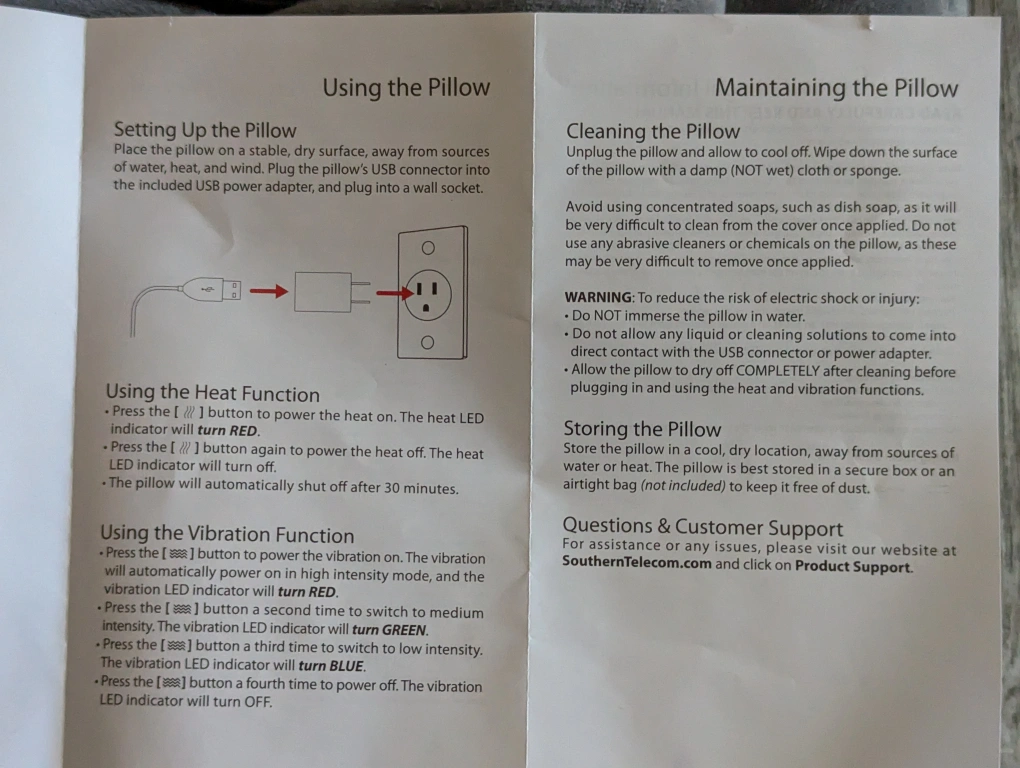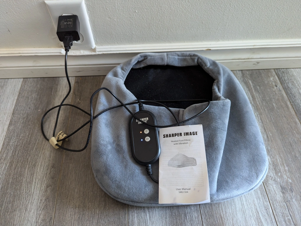 This foot pillow is grey and has a soft, plush exterior. The control unit has a heat button that toggles on/off, and a vibration button that cycles through high, medium, low, and vibration off. It plugs into a wall outlet with the included power adapter, or it can be detached from the adapter and plugged into a USB port.