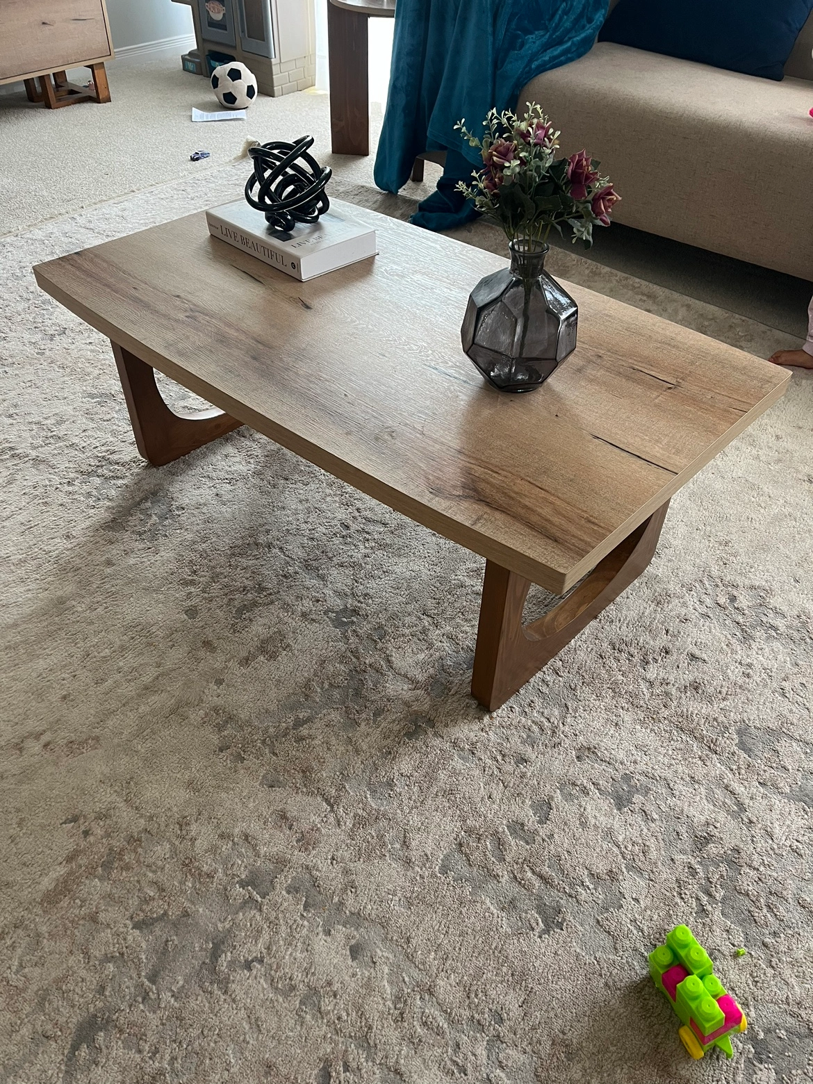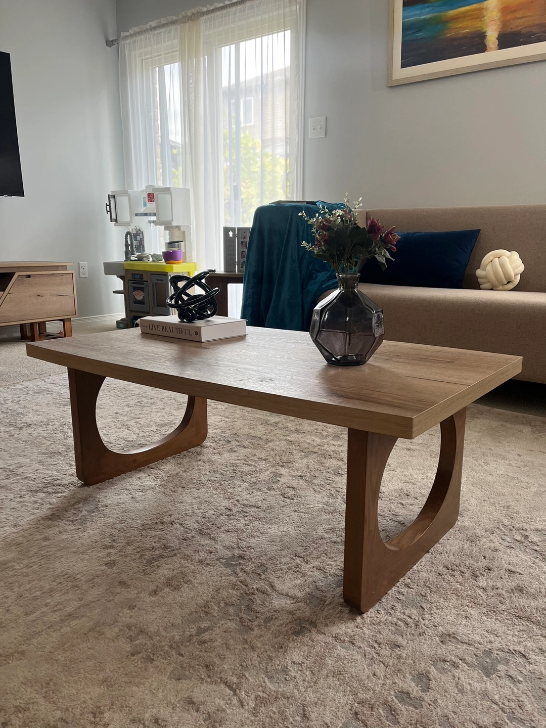 This table is in new condition. It is a great addition to any living room. It has a unique design with a curved top and a solid wooden base. It is perfect for displaying decor or enjoying a cup of coffee.