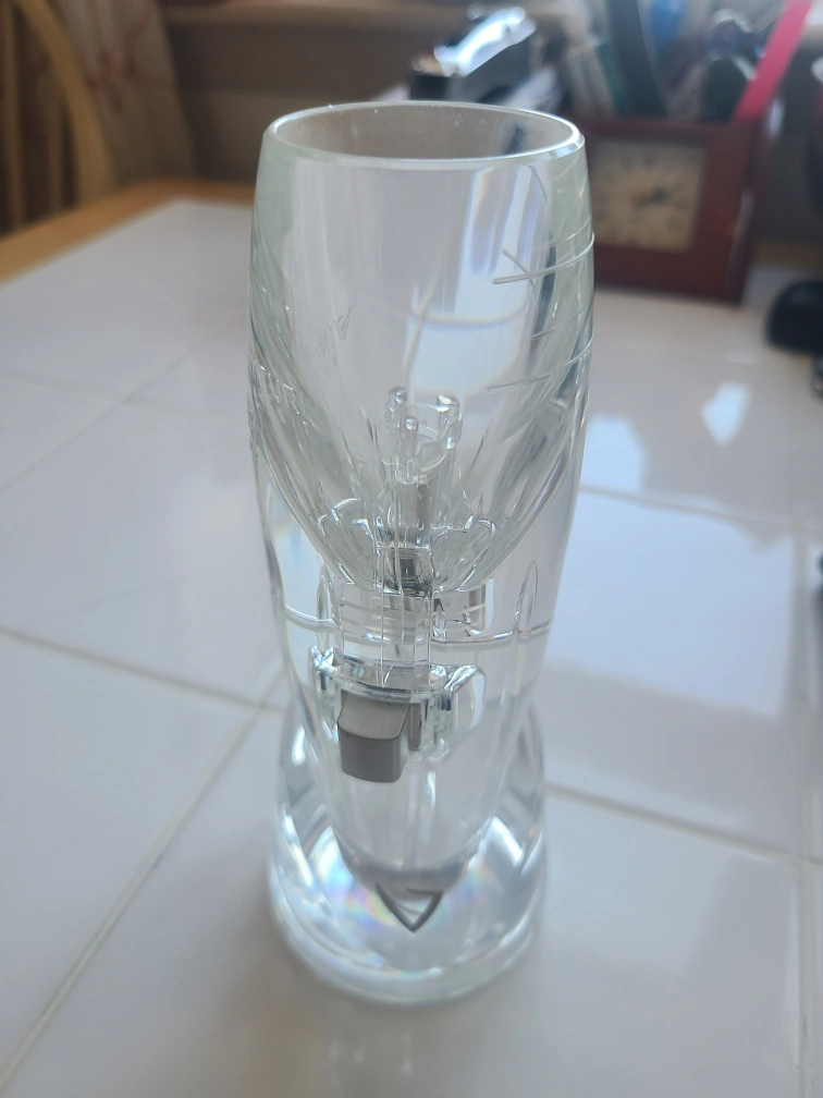 This is a glass wine aerator with a metal base. It has a small button that can be pressed to release the wine.