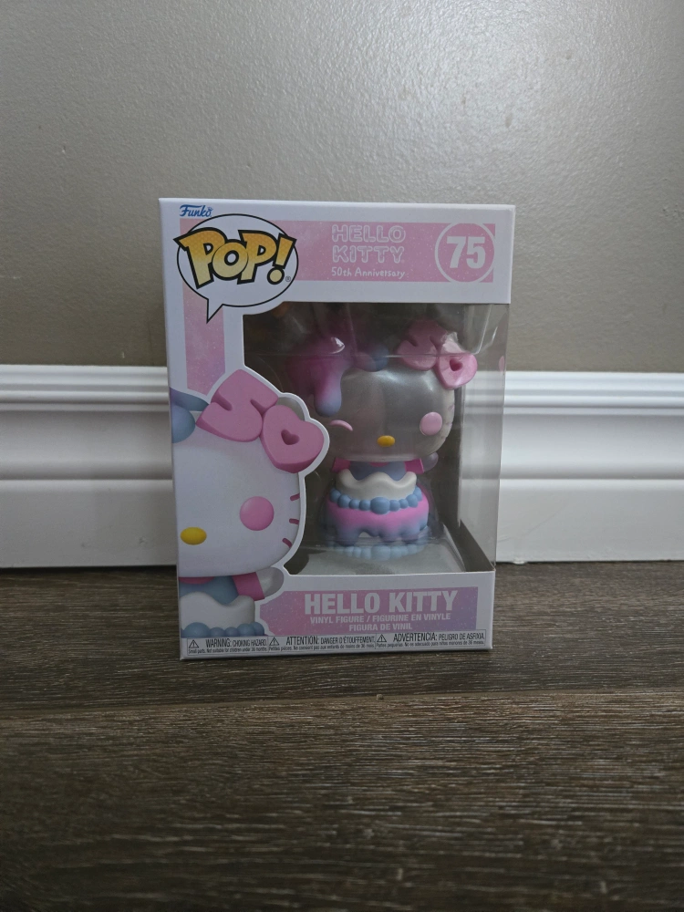 A Funko Pop figure of Hello Kitty in her 50th Anniversary outfit. The figure is in a sealed box.