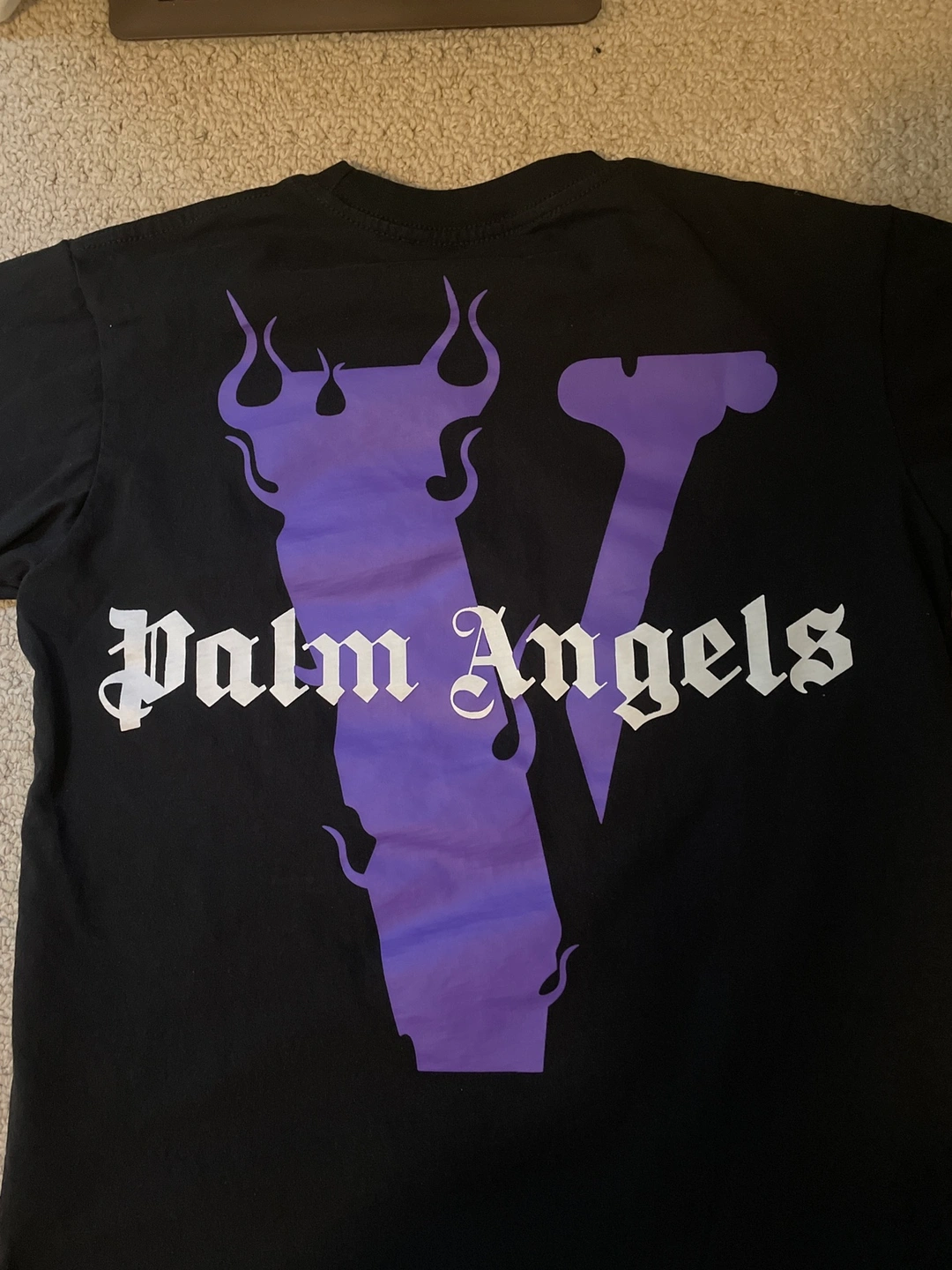 Black T-shirt with purple and white graphic on front and back. The t-shirt is short sleeved. The neck has a V-shaped cut. The back of the shirt has "Palm Angels" written in white and a purple flame graphic. The front has the "1017 ALYX 9SM" logo in a white and purple graphic. The shirt is 100% cotton. It is in good condition.