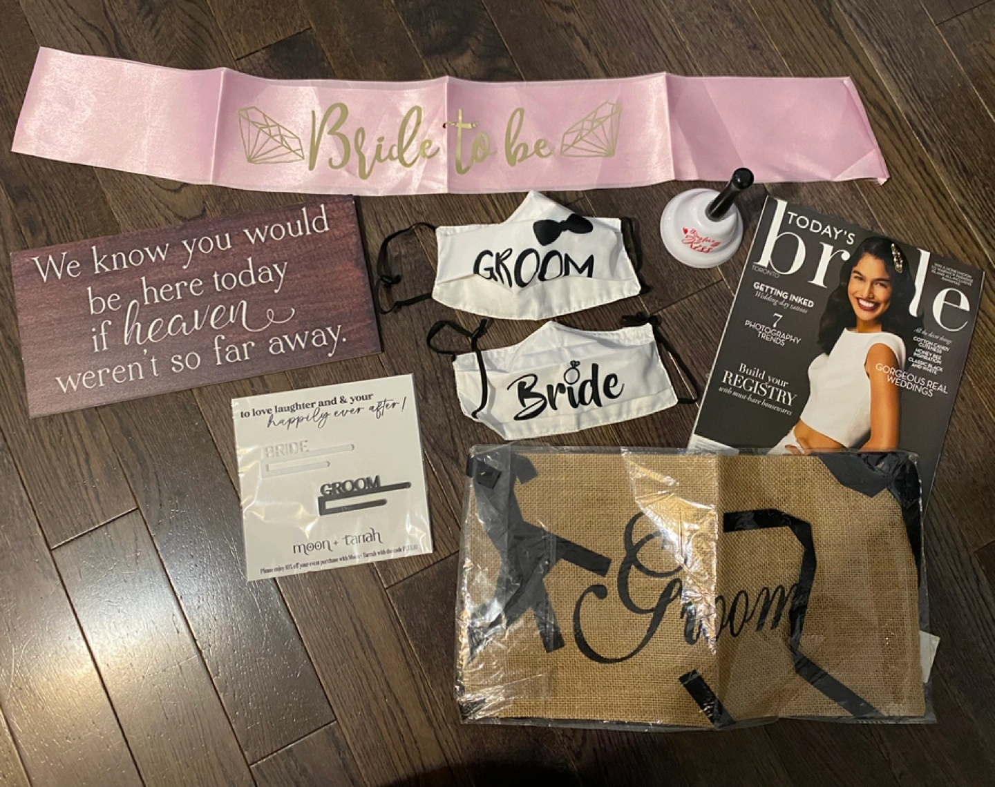 76A set of wedding decorations including a wooden sign, bride and groom face masks, bride and groom burlap seating signs, a wedding bell, bridal magazine, bride/groom wine glass labels, and a bride to be sash. All items are new except the bride to be sash, which was worn one time.