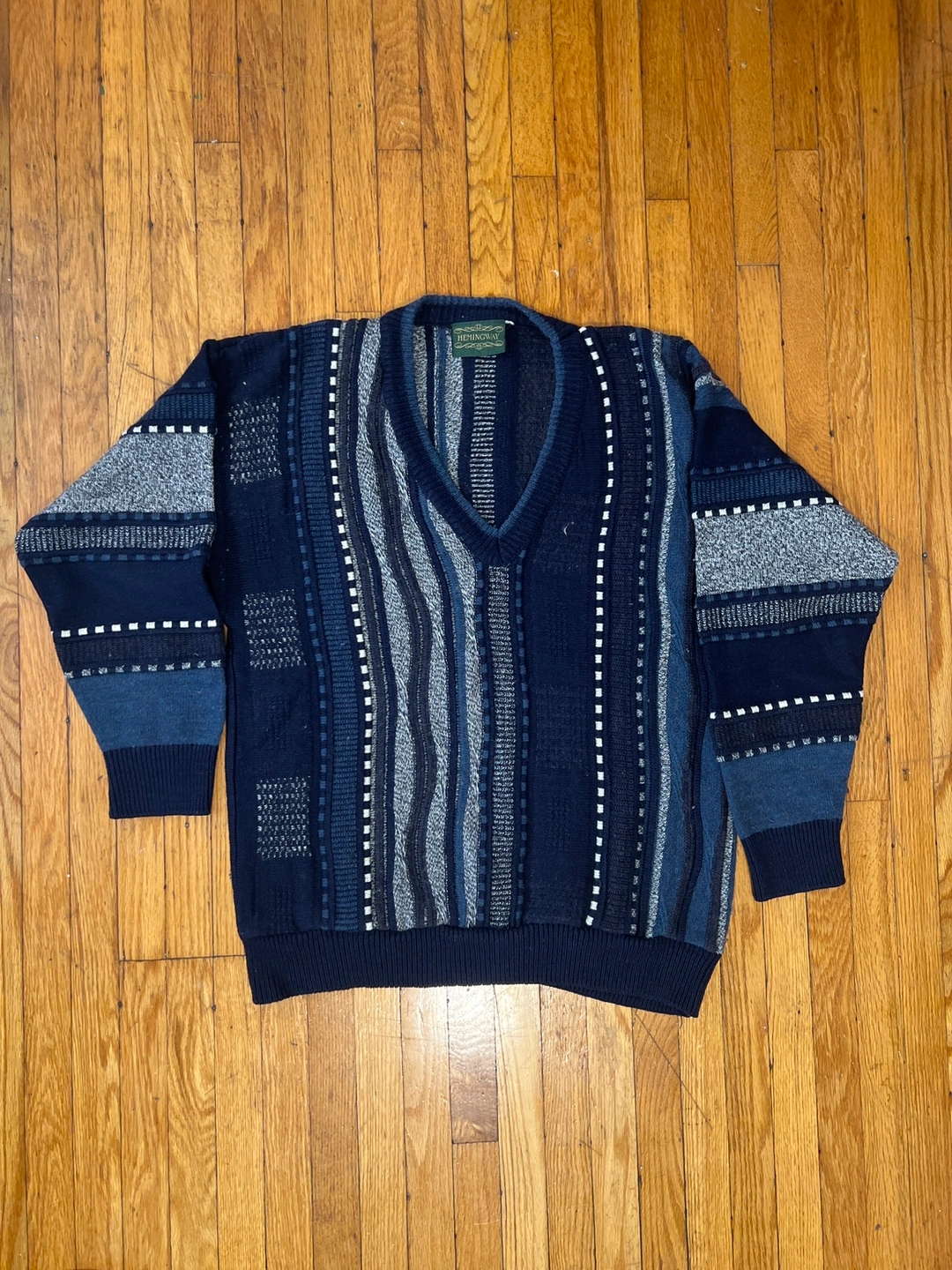 Blue, grey, and white striped sweater with a V-neck. Made by Hemingway. Long sleeves. Knit fabric.