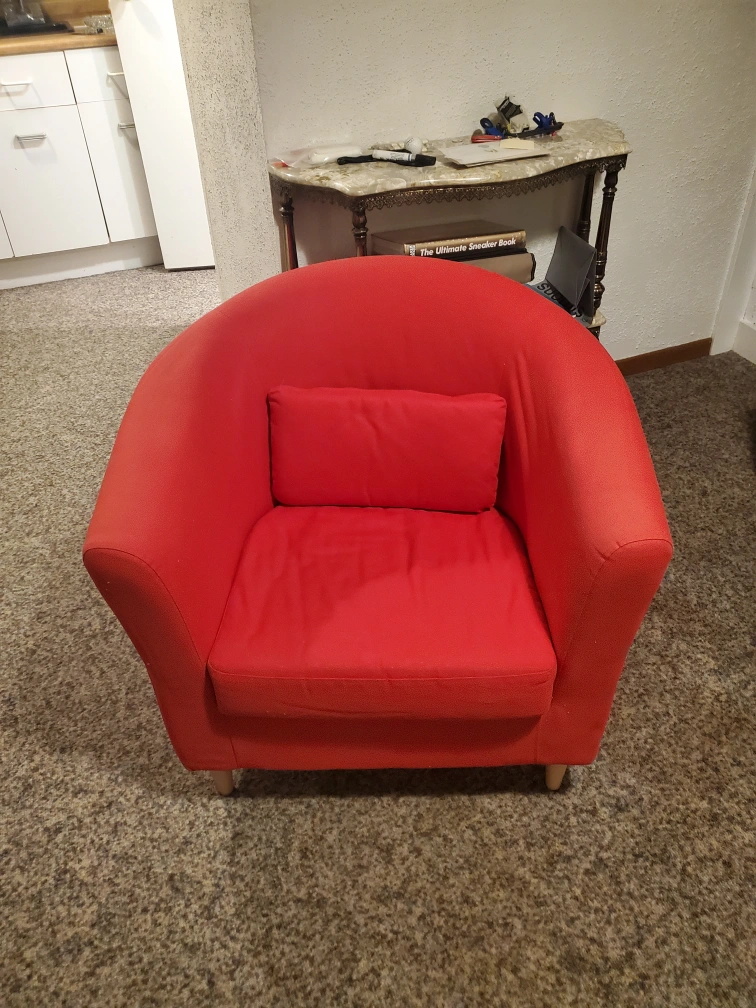 This armchair has a cream coloured fabric cover. It has wooden legs. It is in good condition. There are two of them. They are originally red fabric, both have cream covers on them.