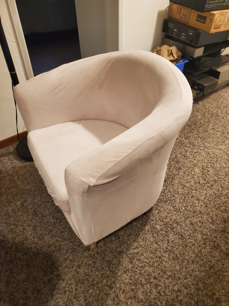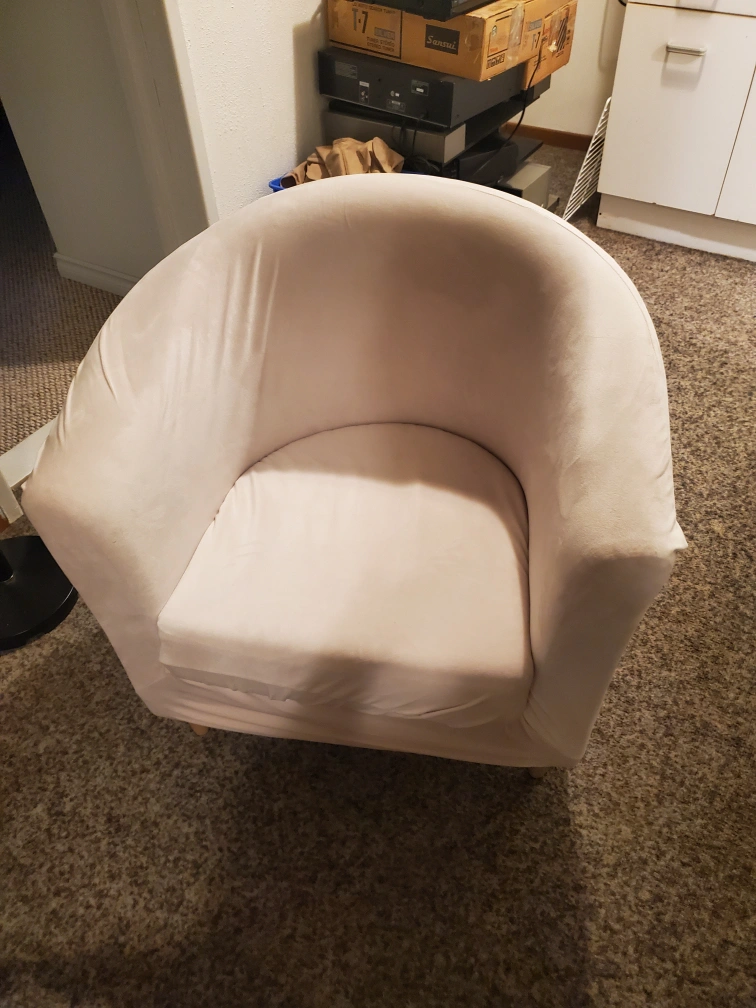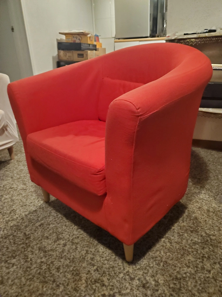 This armchair has a cream coloured fabric cover. It has wooden legs. It is in good condition. There are two of them. They are originally red fabric, both have cream covers on them.