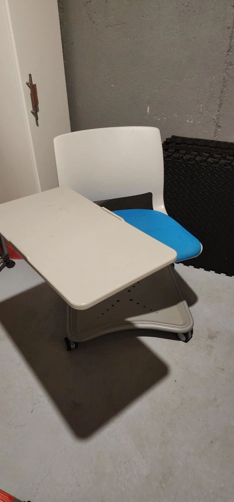 A rolling chair with a desk attached to the back of the chair. The seat has a blue cushion.