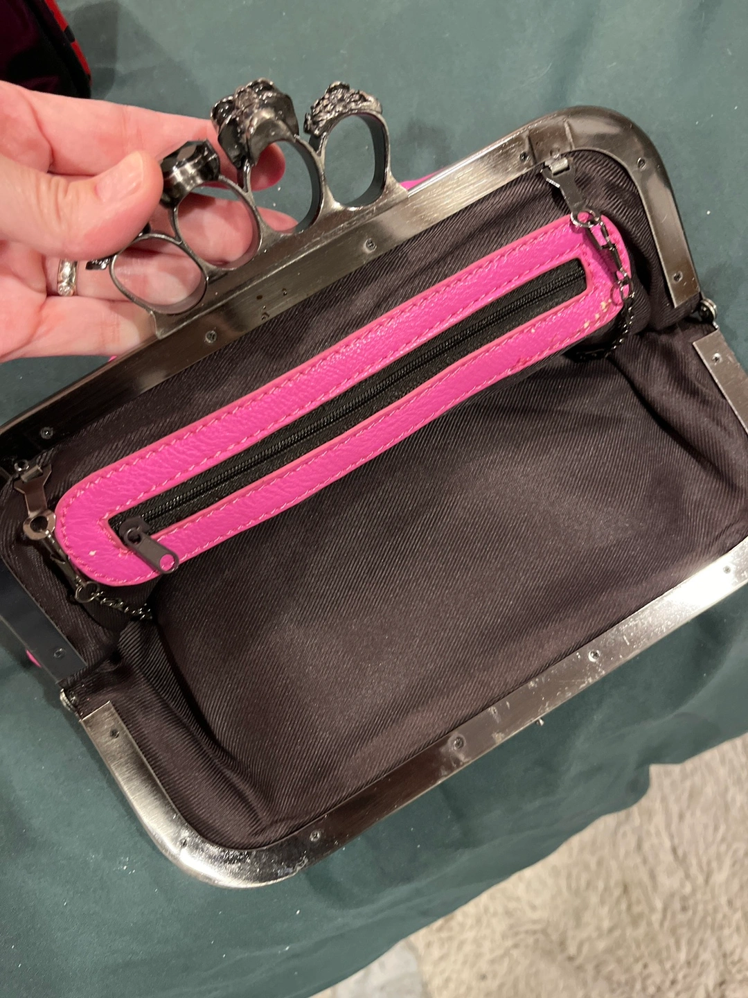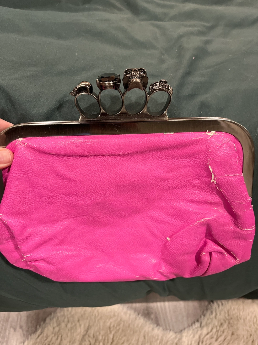 A pink clutch purse with a skull and brass knuckles ring closure. Includes a detachable chain strap. Pink faux leather is cracking but this skull brass knuckles clutch frame is DYING to be repurposed. Any crafty folks into it?