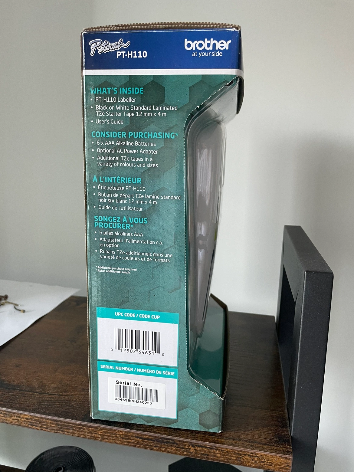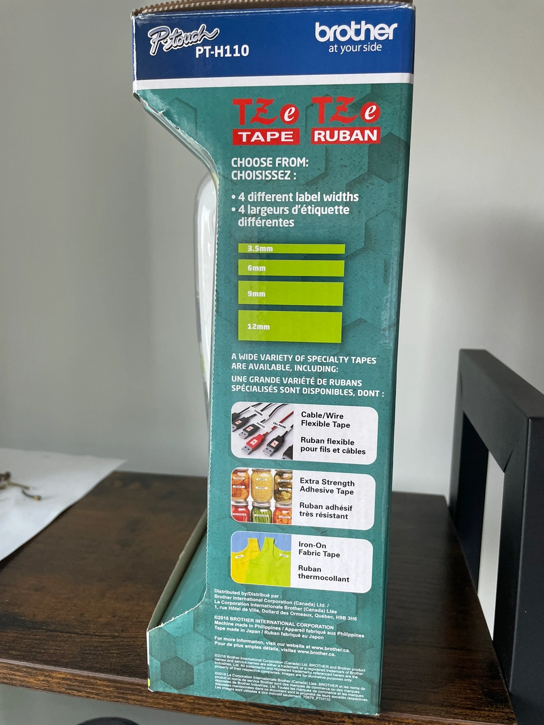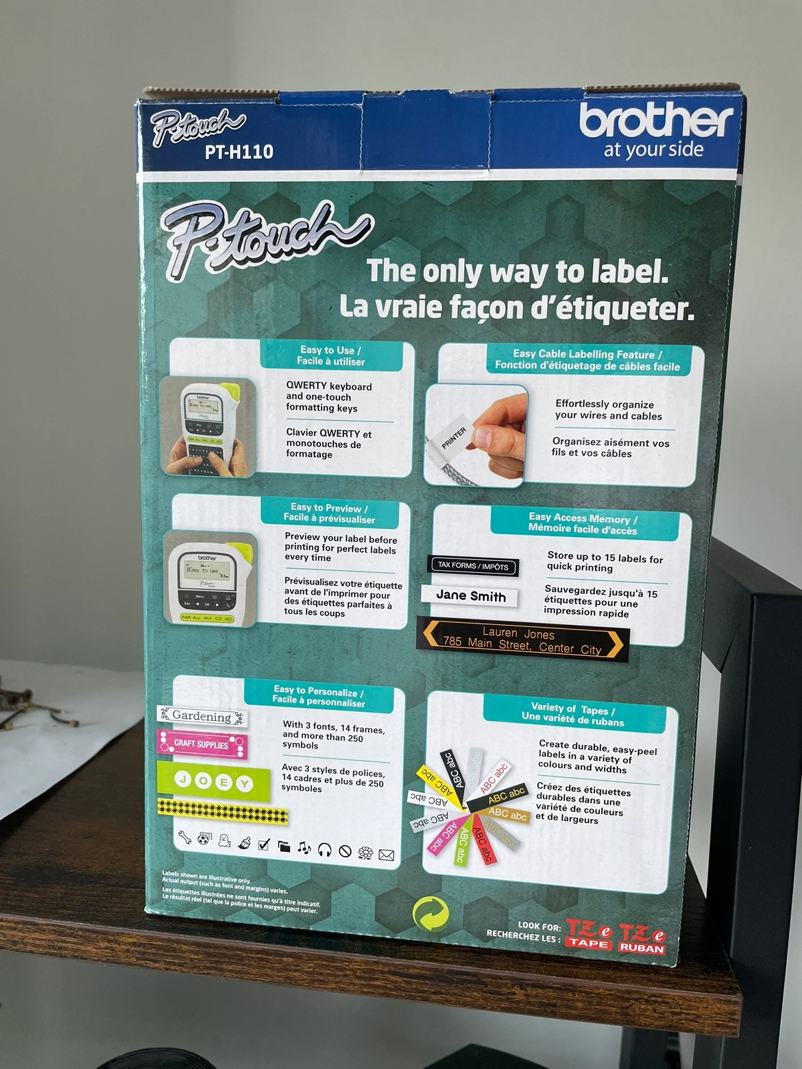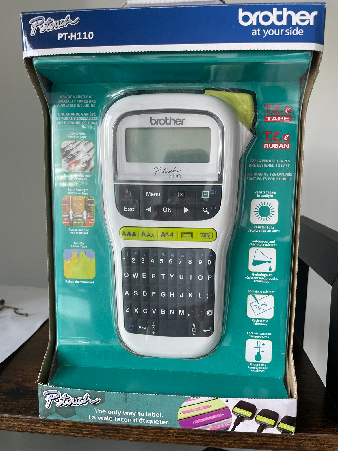 This listing is for a Brother P-touch PT-H110 Label Maker. This label maker features a QWERTY keyboard, a variety of fonts and frames, and includes a starter pack of laminated tape. The label maker is in very good condition and has been used sparingly. It is powered by 6 AAA batteries (not included). This is an excellent label maker for home or office use.