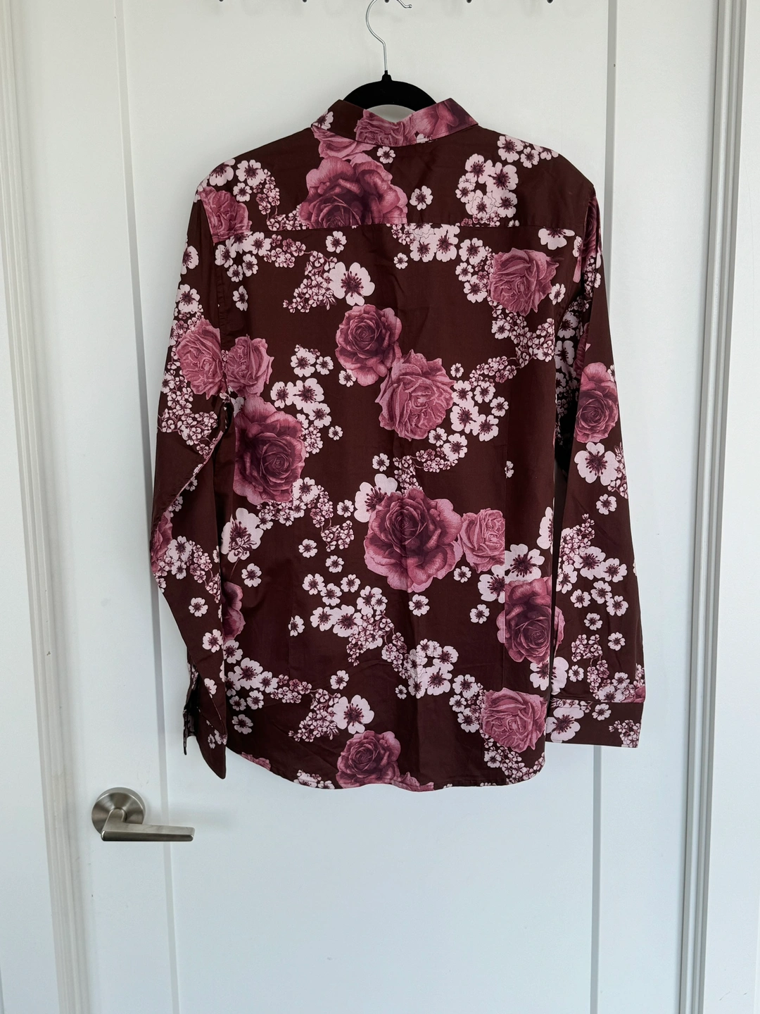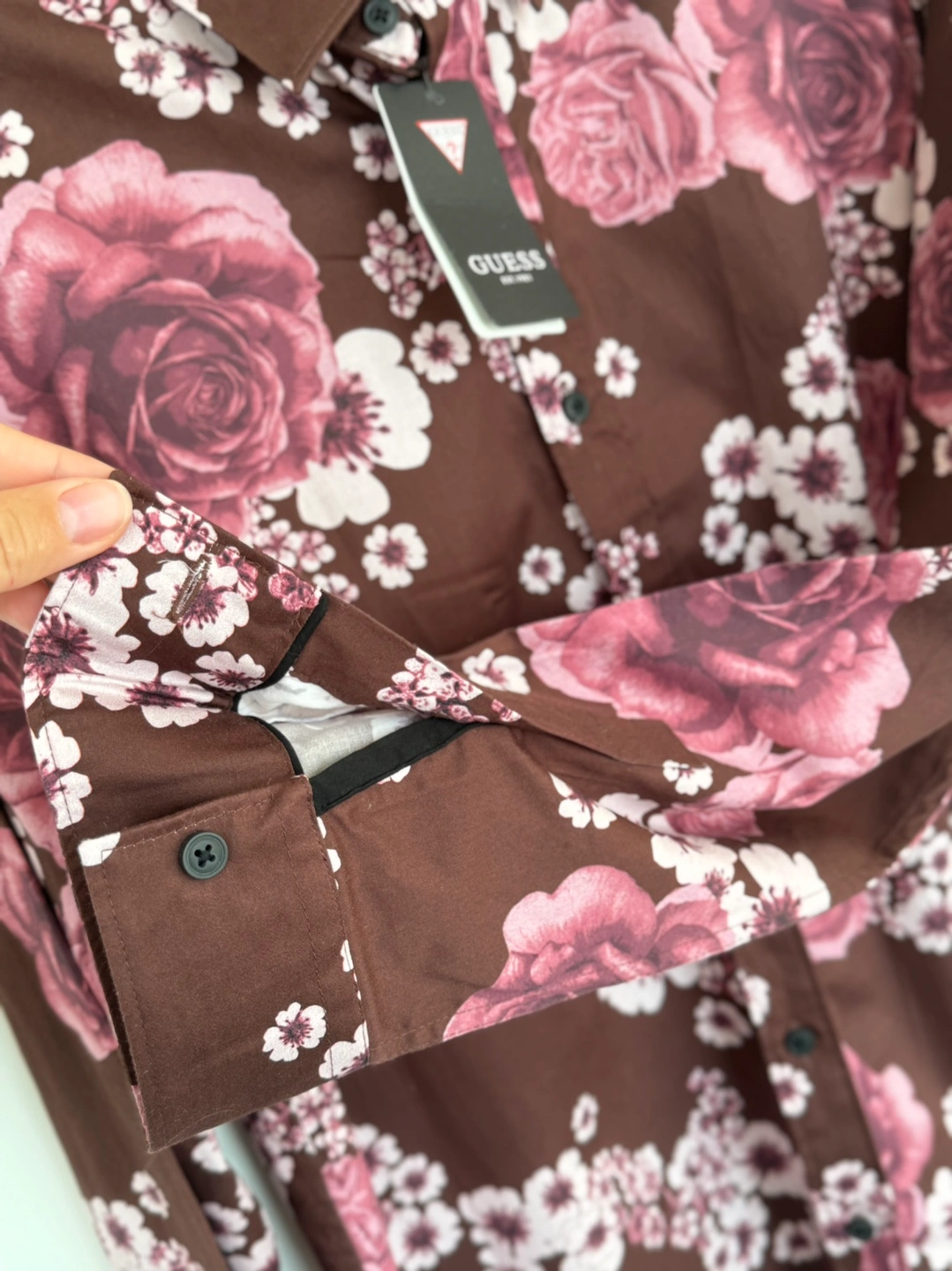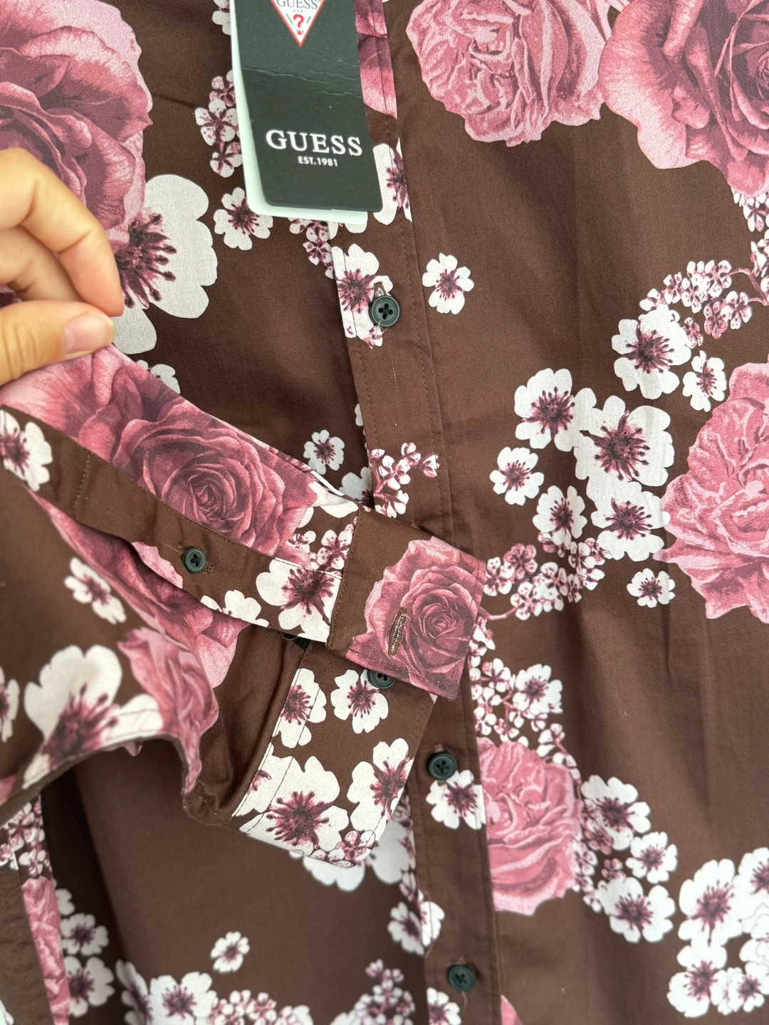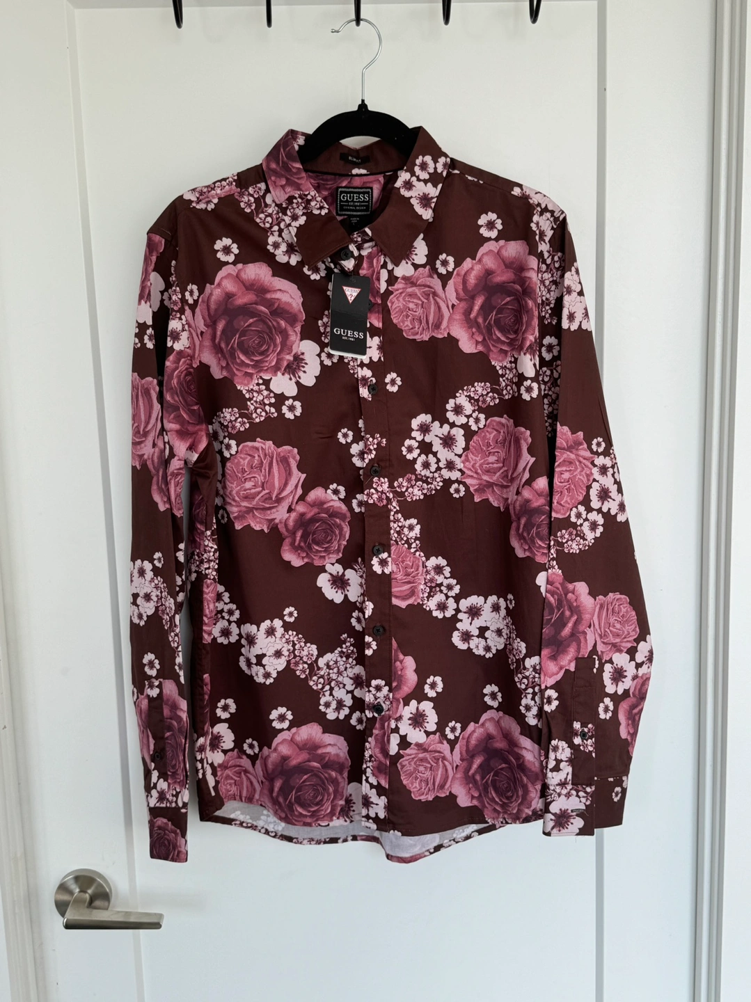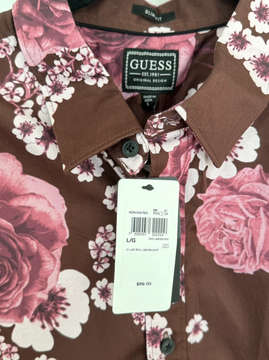 This Guess men's long sleeve shirt features a floral pattern with brown and pink tones. The shirt is made from a soft and comfortable fabric. It is in a size large and is new with tags.