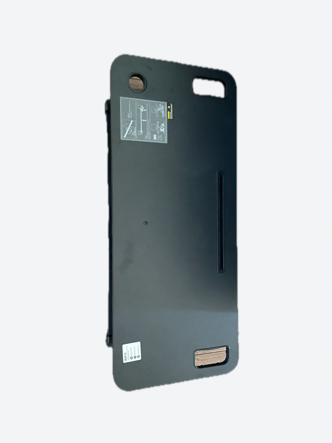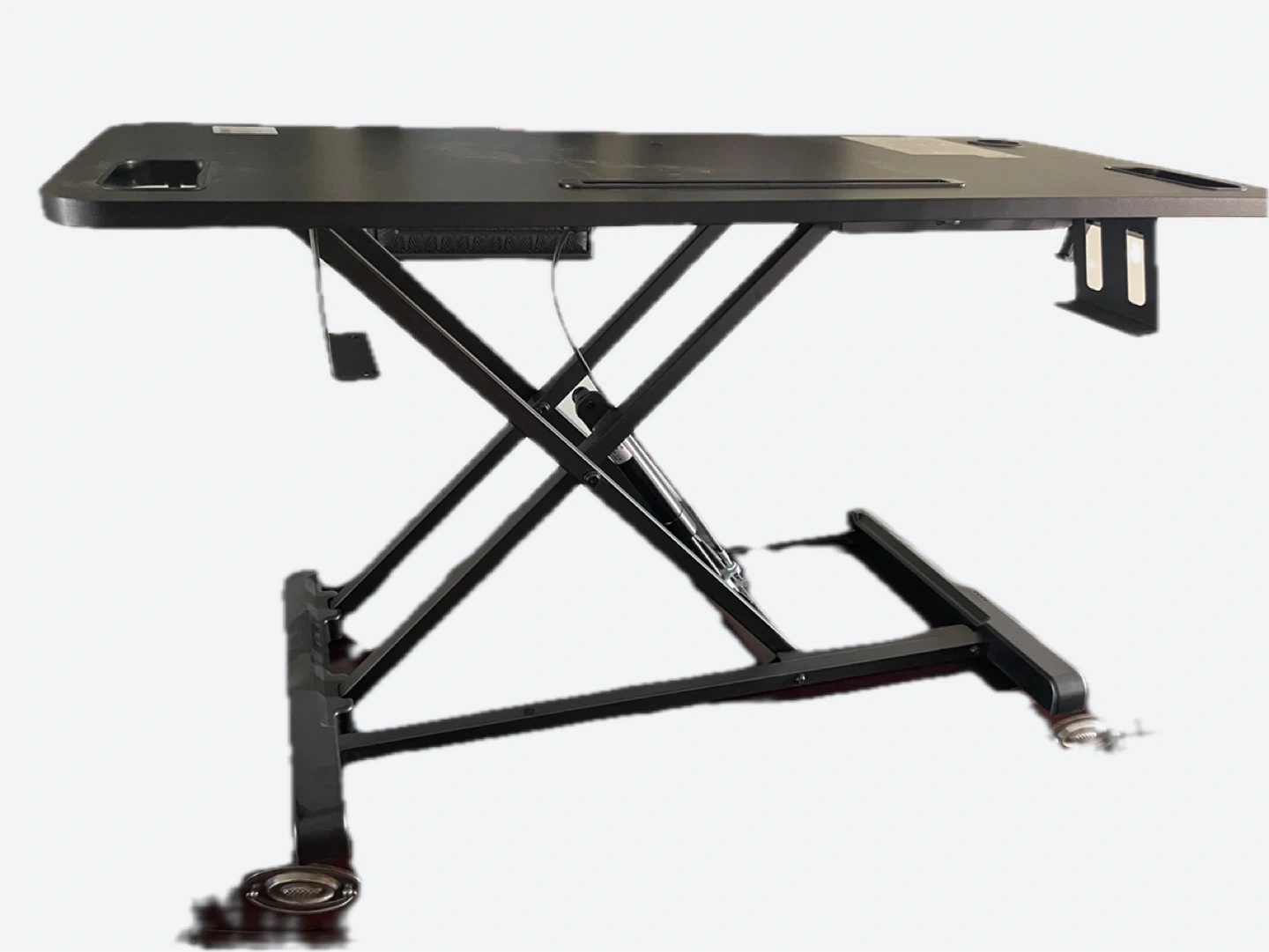This is a black standing desk converter with a scissor lift mechanism. It's a versatile workstation that can be raised or lowered easily. The surface is smooth and durable, ideal for any home office setup.