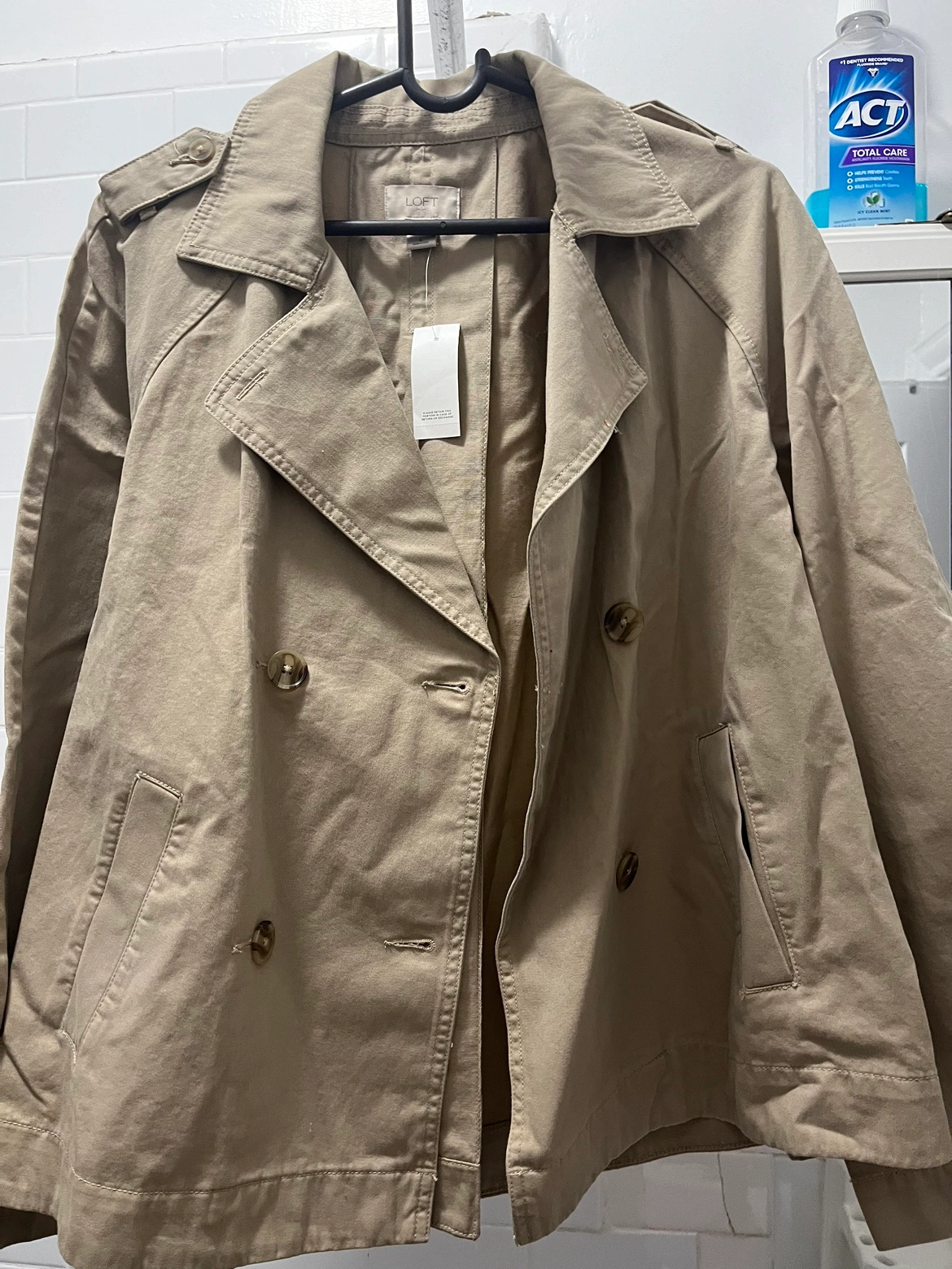 Size Large, Beige, with a button closure. Has two flap pockets and one chest pocket.