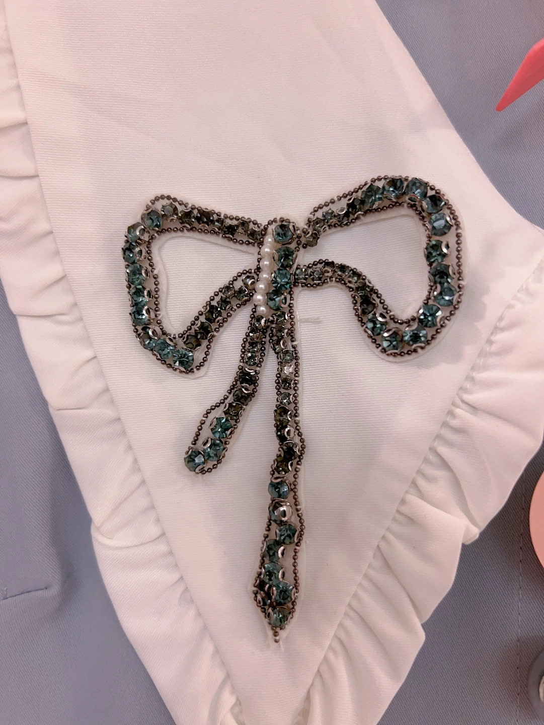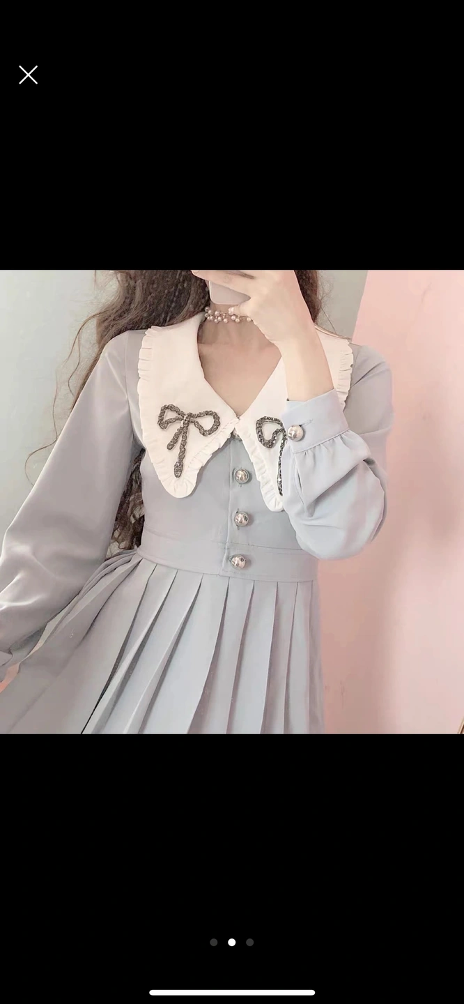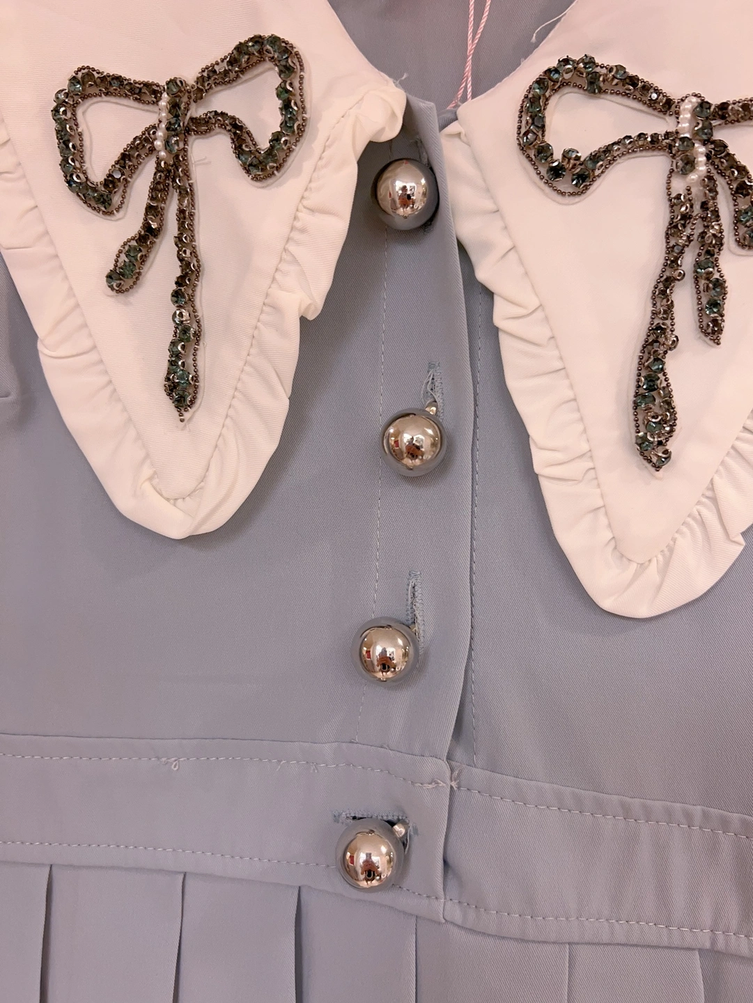 A light blue dress with a white Peter Pan collar decorated with two rhinestone bows. The dress has long sleeves and a button up front. It also features a pleated skirt.