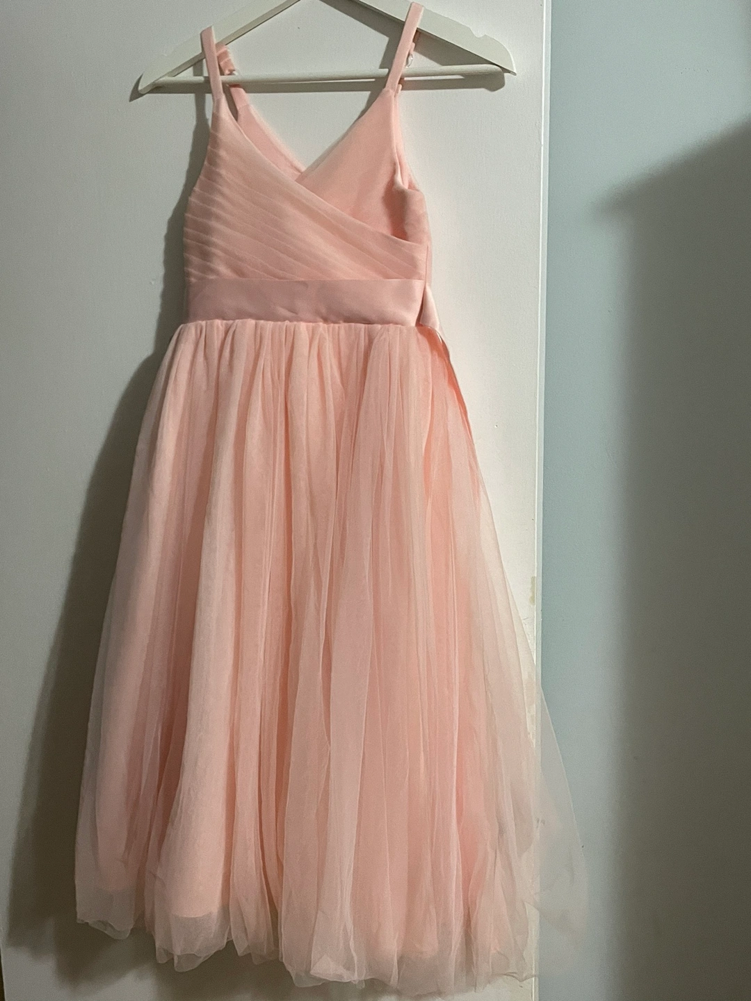 A beautiful pink tulle dress with spaghetti straps and a satin sash. It is in great condition as used only once and would be perfect for a special occasion.