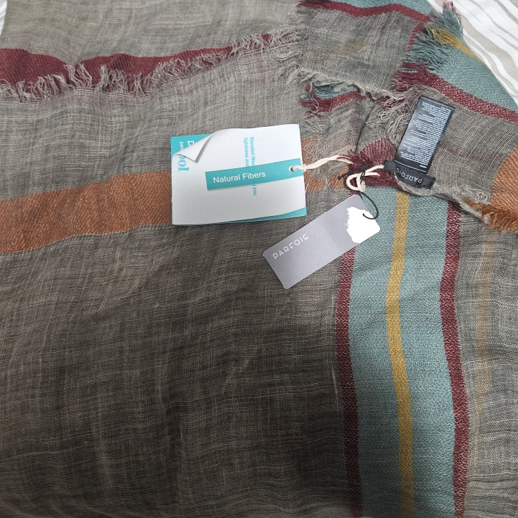 A nice blended wool scarf with stripes of grey, red, orange, yellow, and blue. Made from natural fibers.