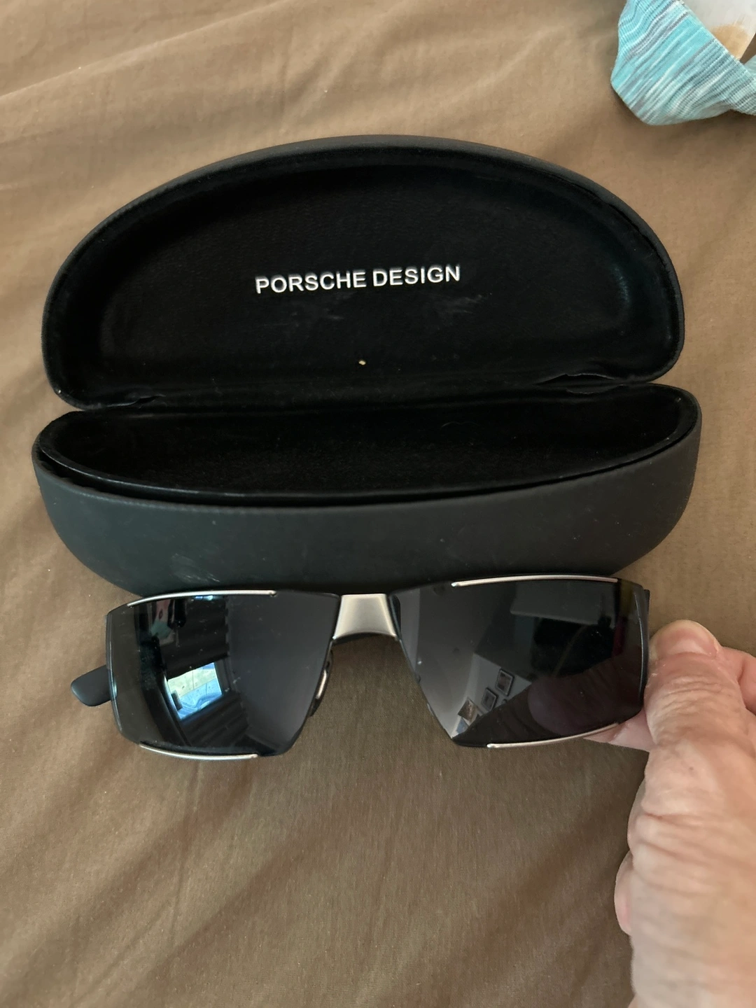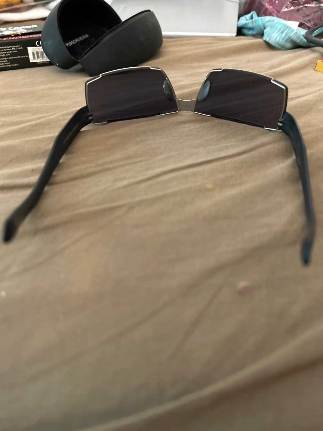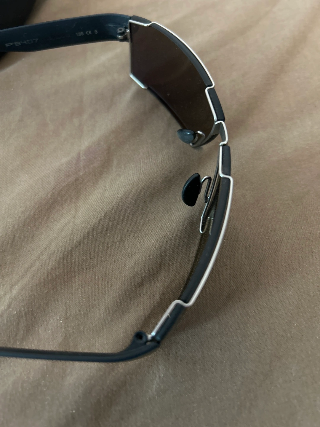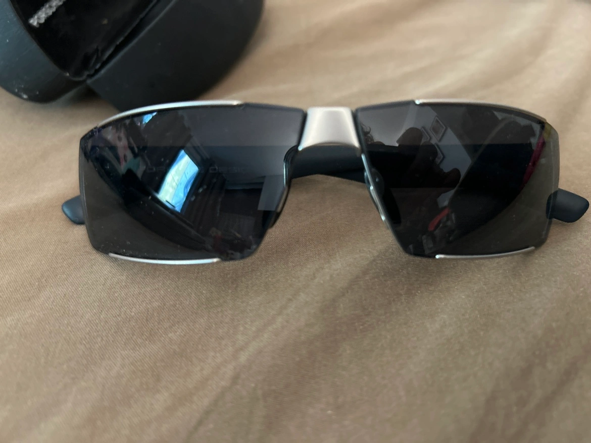 613Sunglasses come with a black case. The lenses are gray and the frames are black and silver. They are a wraparound style with a slightly squared shape. The arms are marked "PS 647" and "CE."