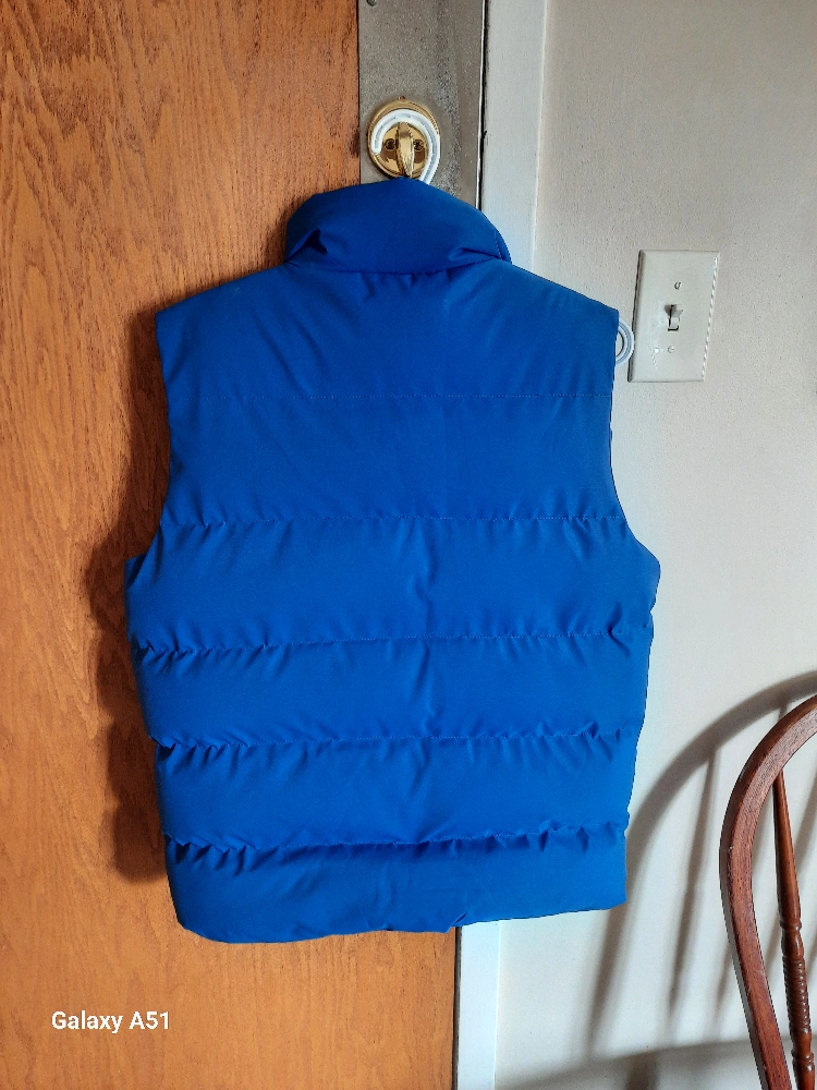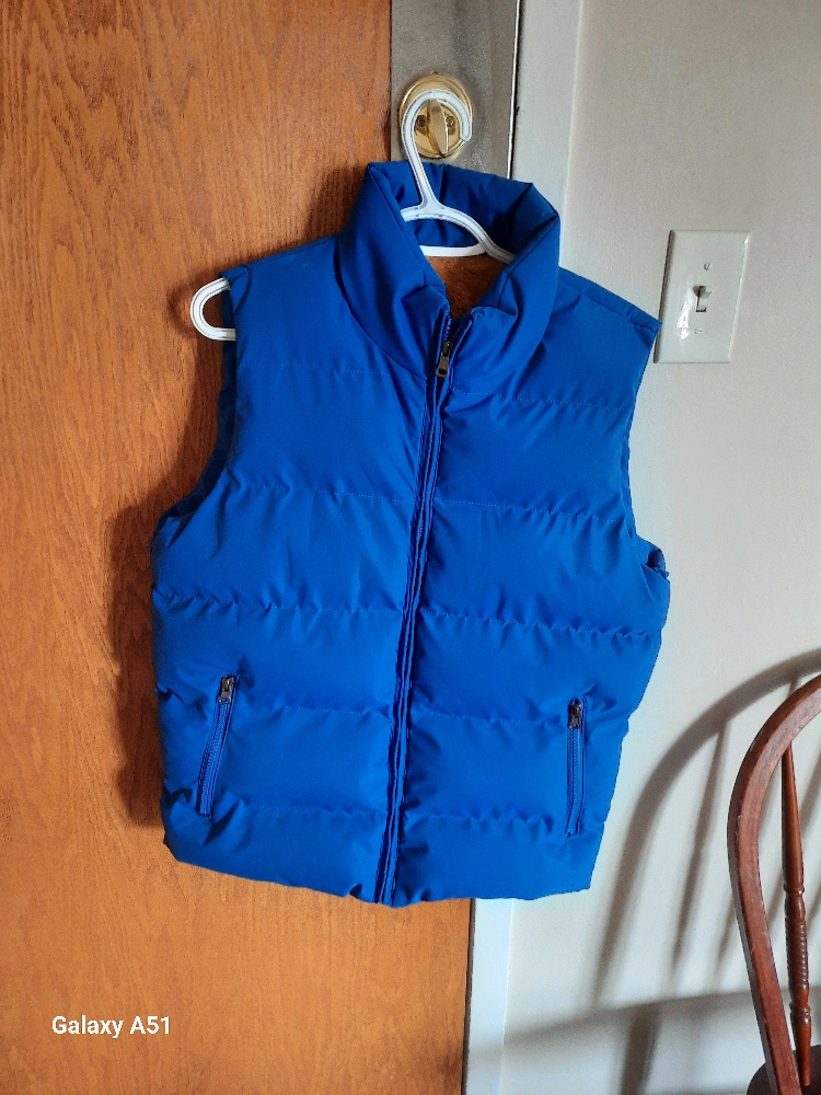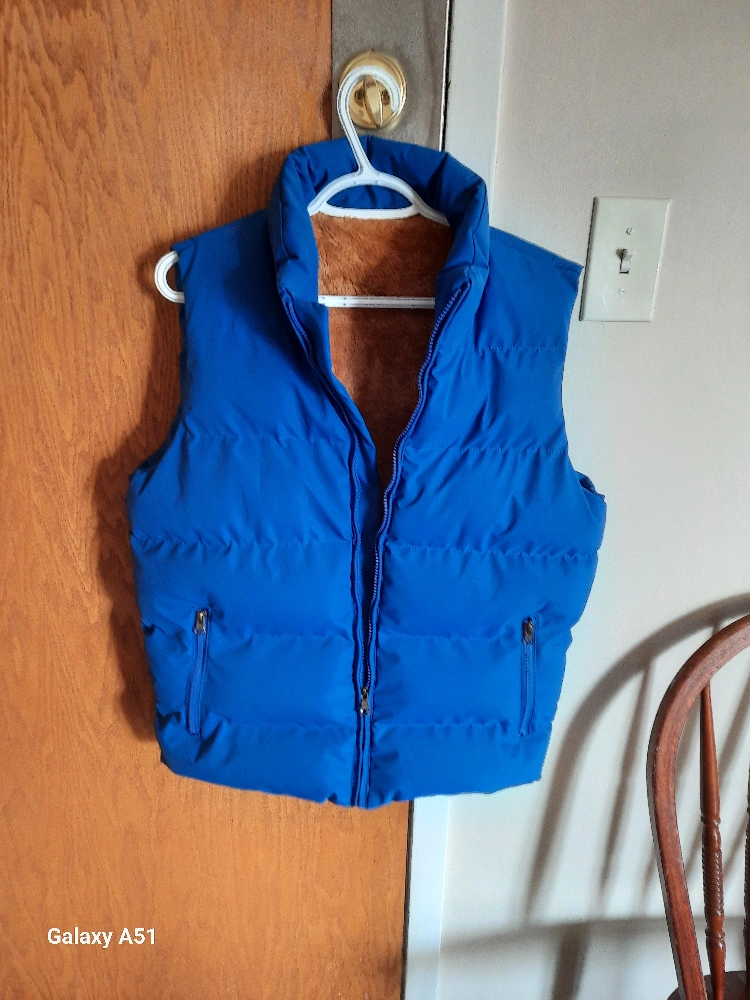 A blue puffer vest with a zipper closure and two deep pockets, and one hidden deep pocket on inside..very warm..beautiful royal blue color..brand new..pick up only.