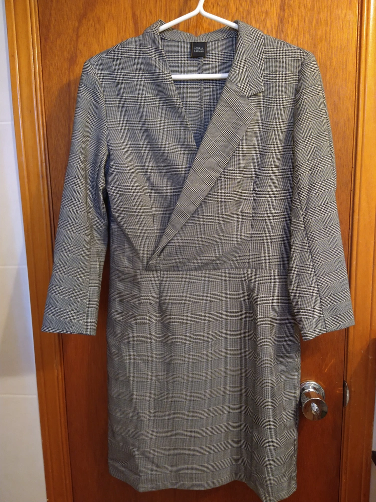 Worn twice. Decluttering. Grey and black plaid dress with 3/4 sleeves and a v-neck. The dress has a wrap-style design and a fitted silhouette. Asymmetrical collar design. Side zipper. Best for office attire. Singapore brand.