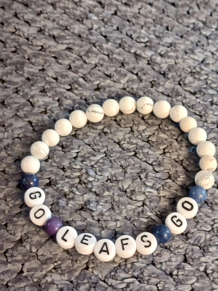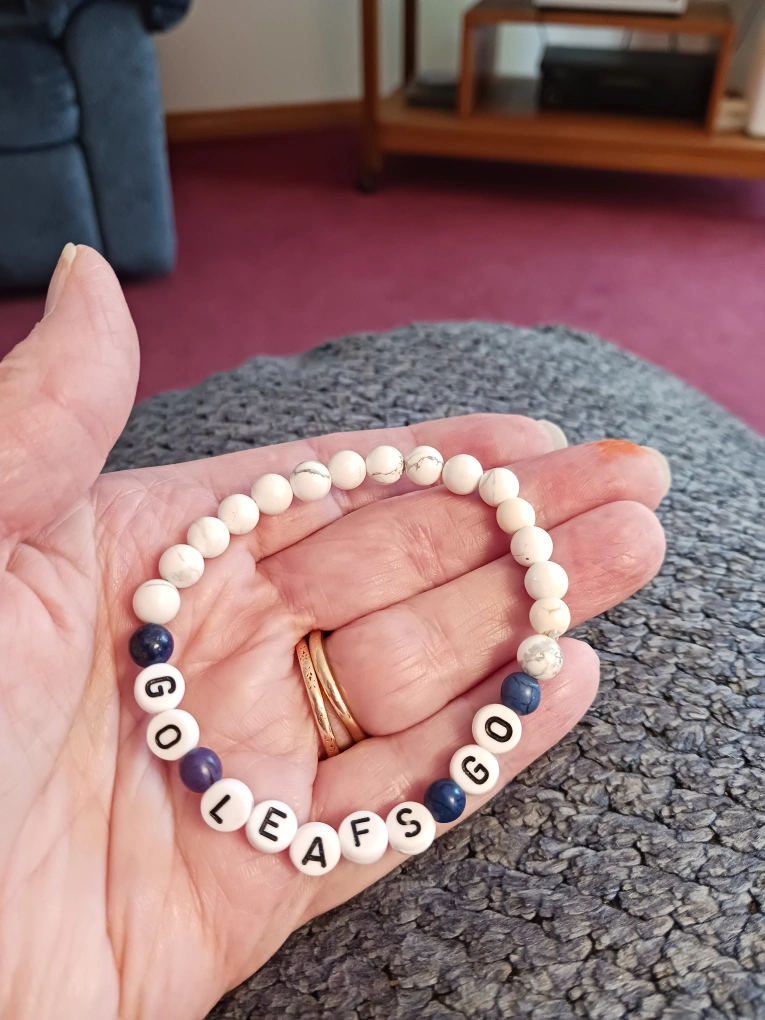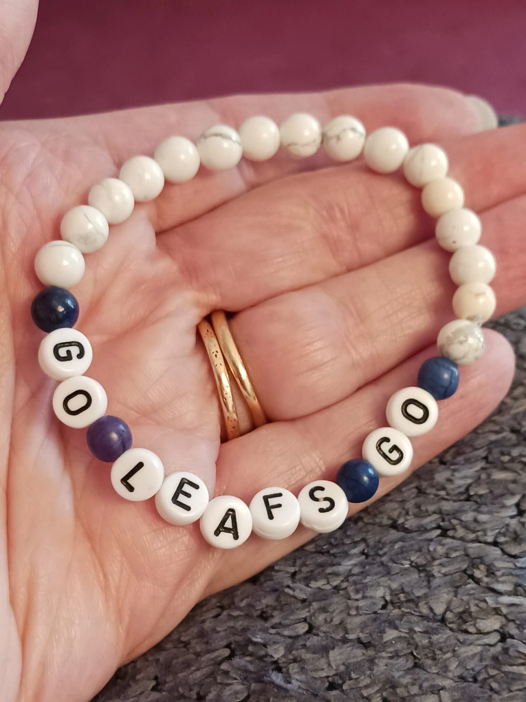 401White and blue beaded bracelet with "Go Leafs Go" spelled out in black lettering.