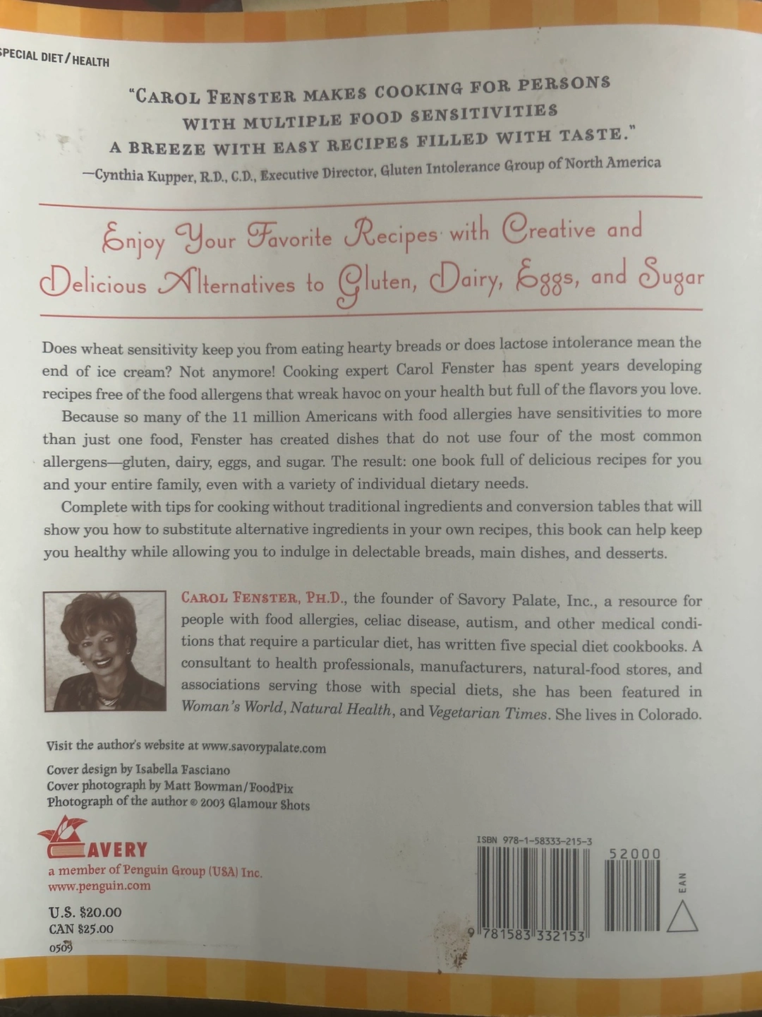 This cookbook is by Carol Fenster, PhD. It is a revised and updated cookbook. The book provides recipes that are free of wheat, gluten, dairy, eggs and sugar. It includes 200 recipes and menus.