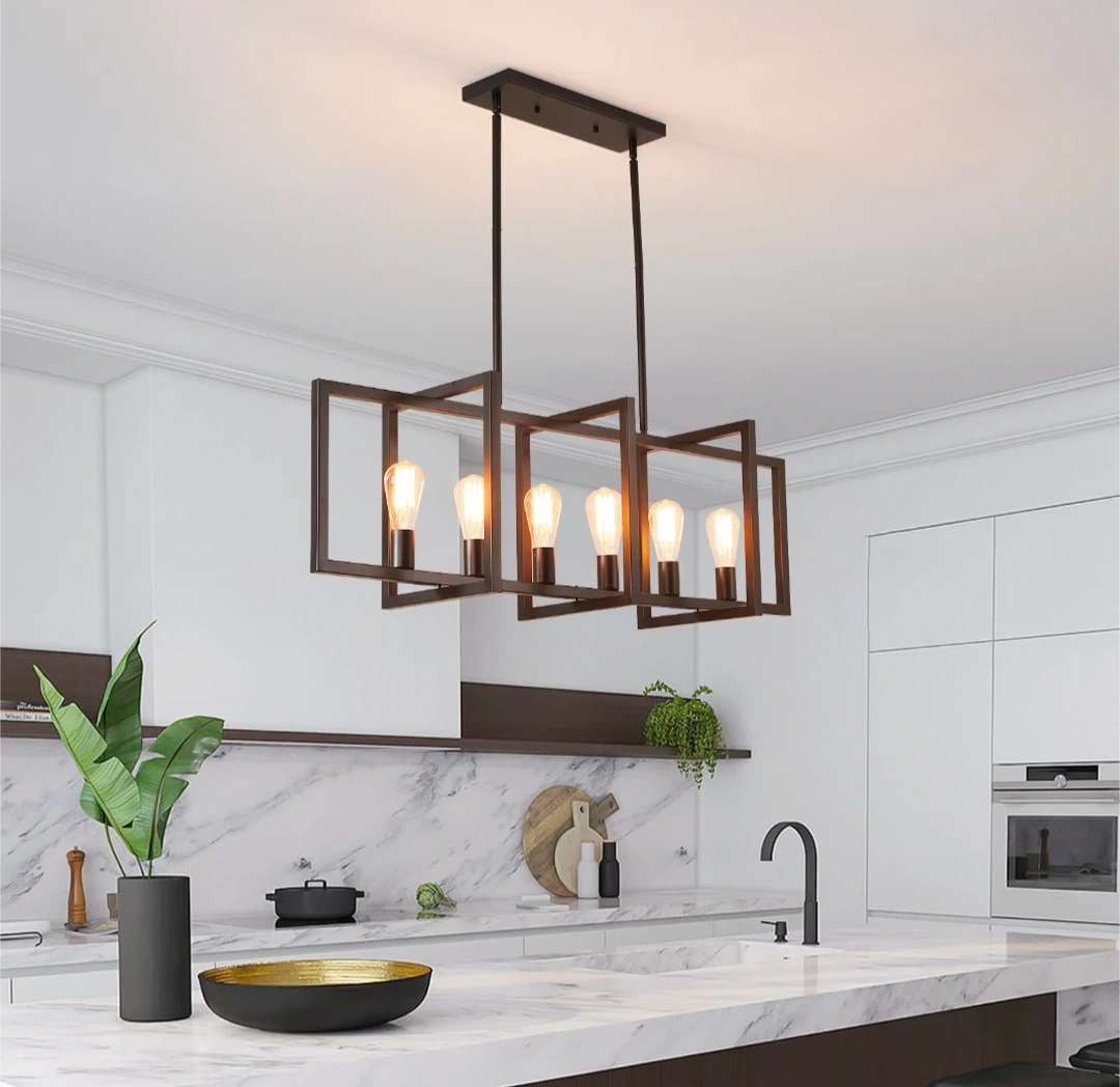 A 6 light chandelier with black metal framework. The chandelier features a long, rectangular design with six square light fixtures. The light bulbs are not included.