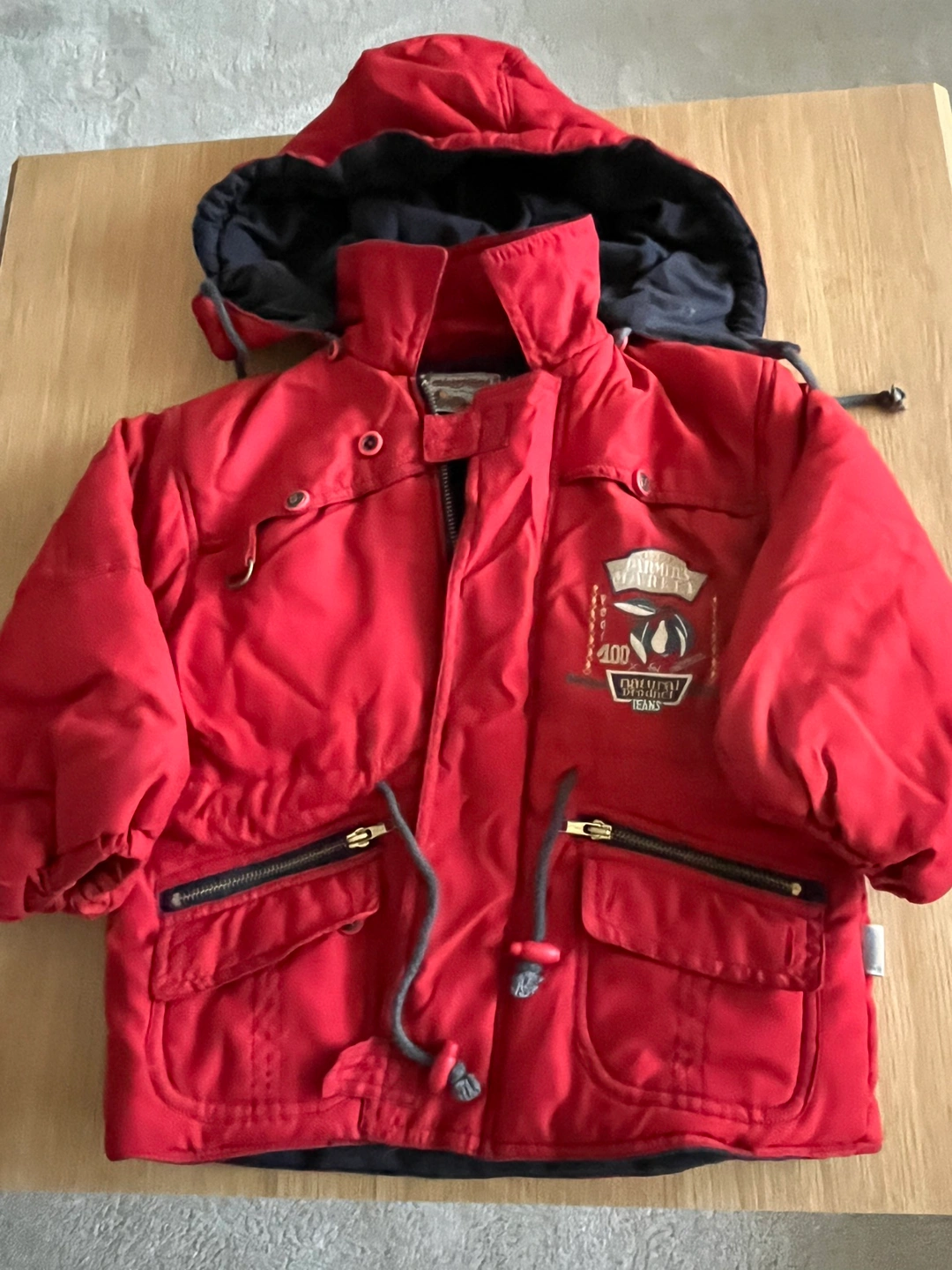 Children's red winter jacket with a hood. The jacket has a zipper and button closure. It has two pockets on the front and a small pouch pocket on the back.