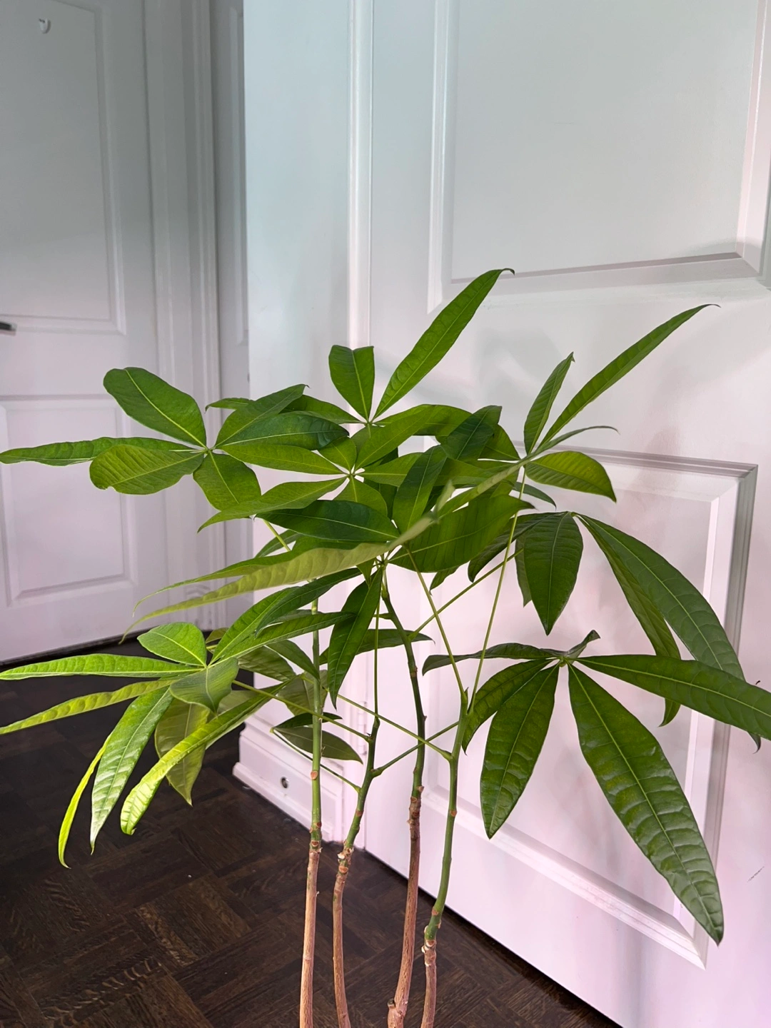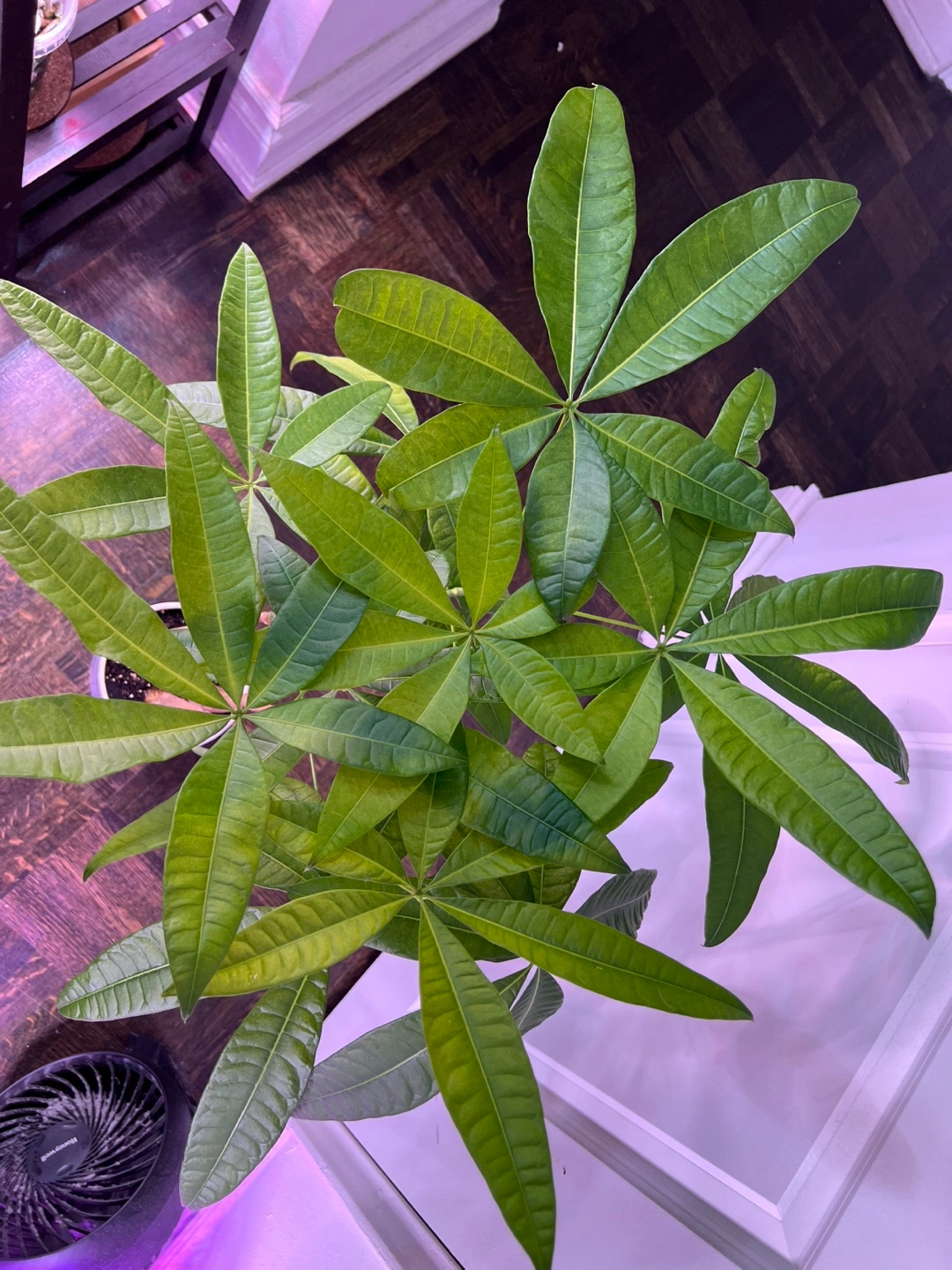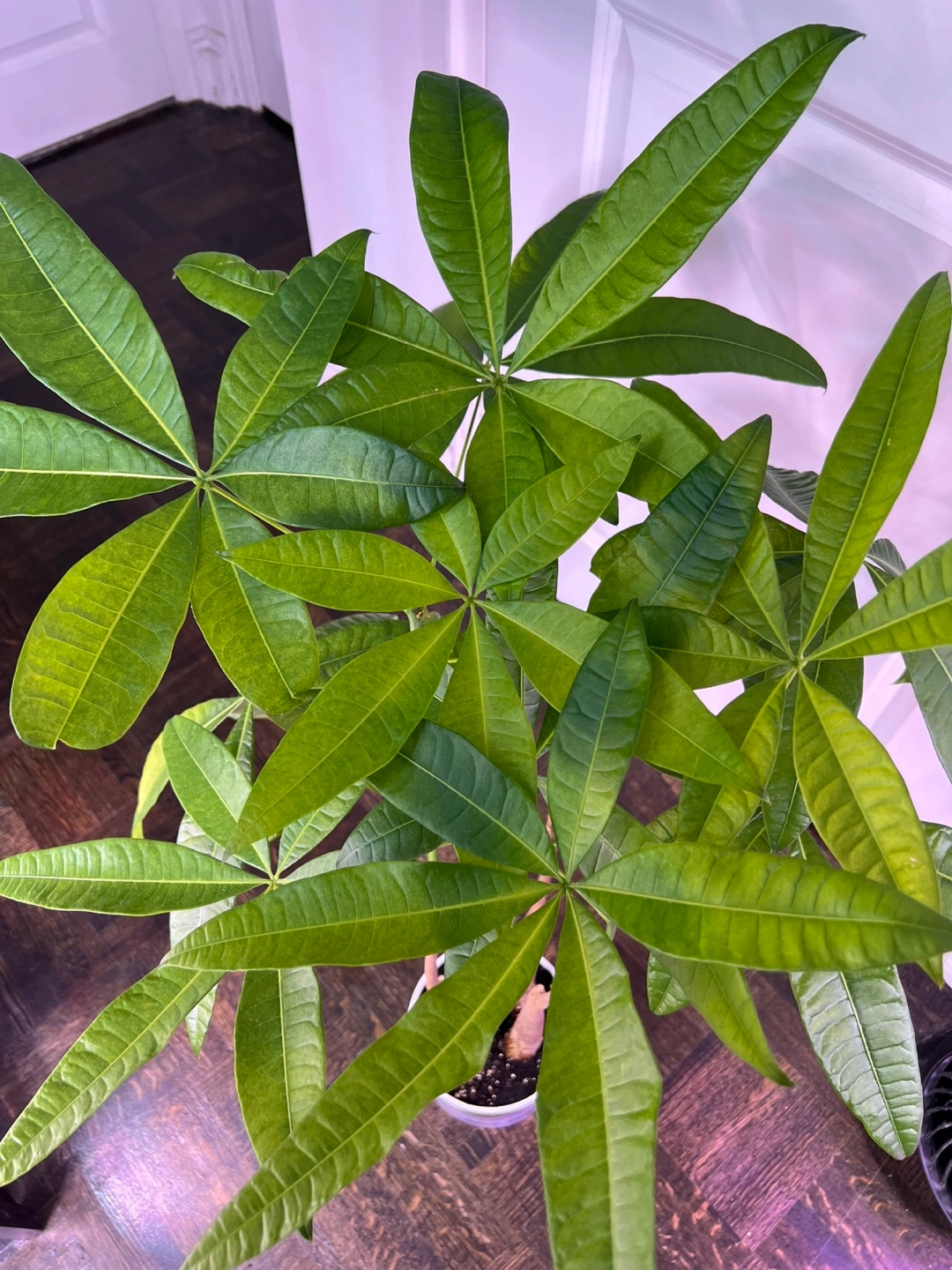 A beautiful healthy money tree plant in a white pot. It is a low maintenance, easy care plant that thrives in bright, indirect light.