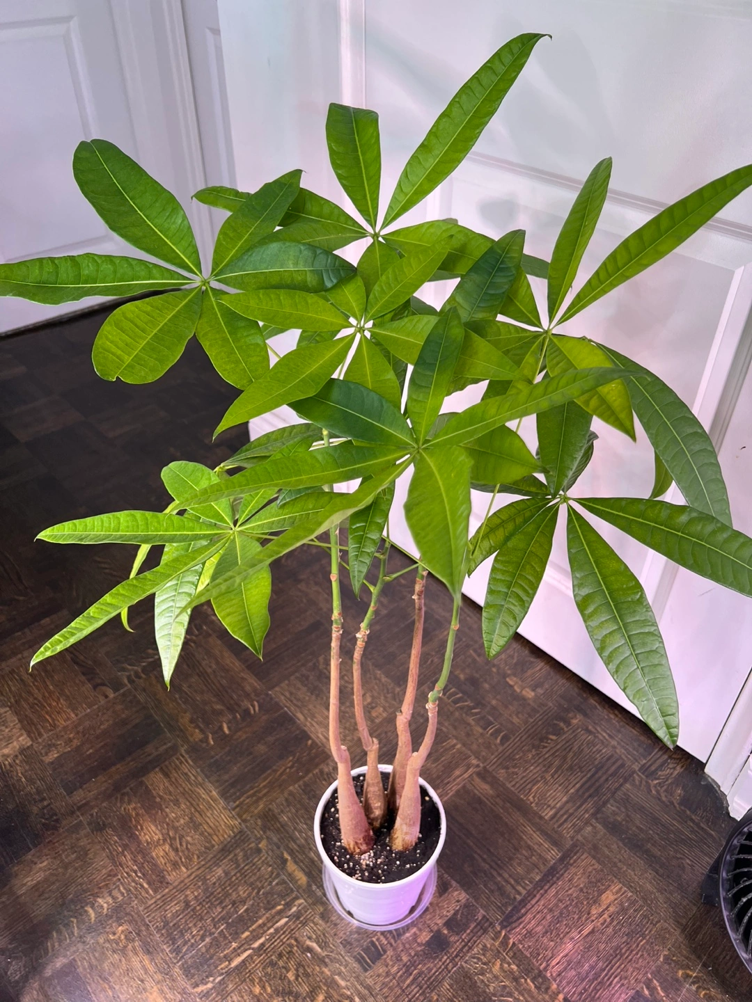 A beautiful healthy money tree plant in a white pot. It is a low maintenance, easy care plant that thrives in bright, indirect light.
