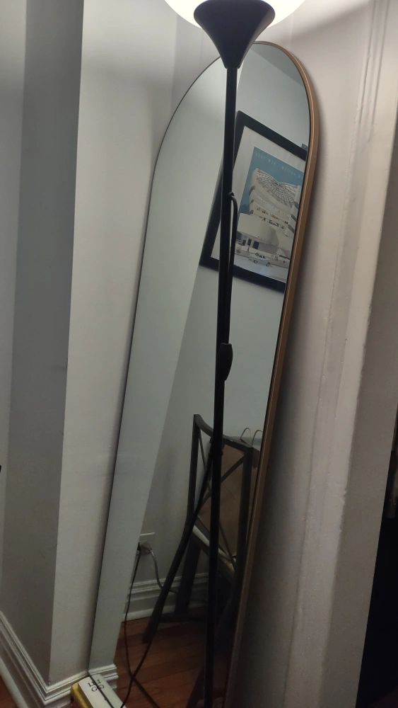 Gold framed, full-length floor standing arched mirror. Good condition. Can be rested on floor or hung on wall with existing hardware. Originally $160