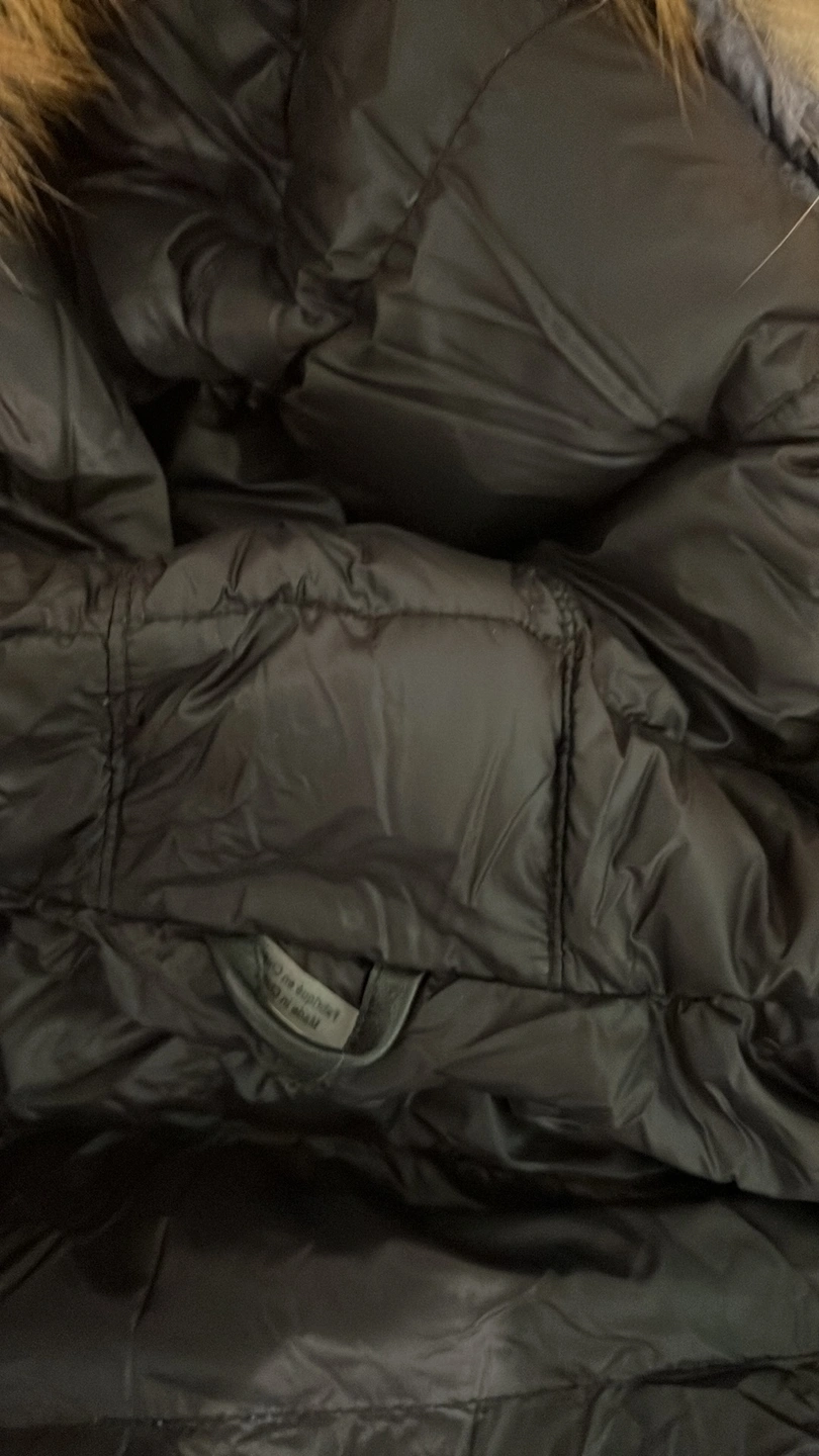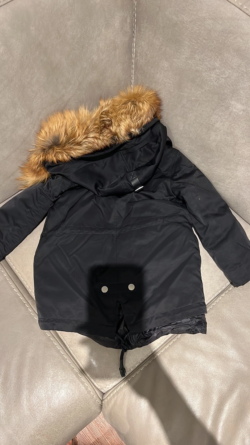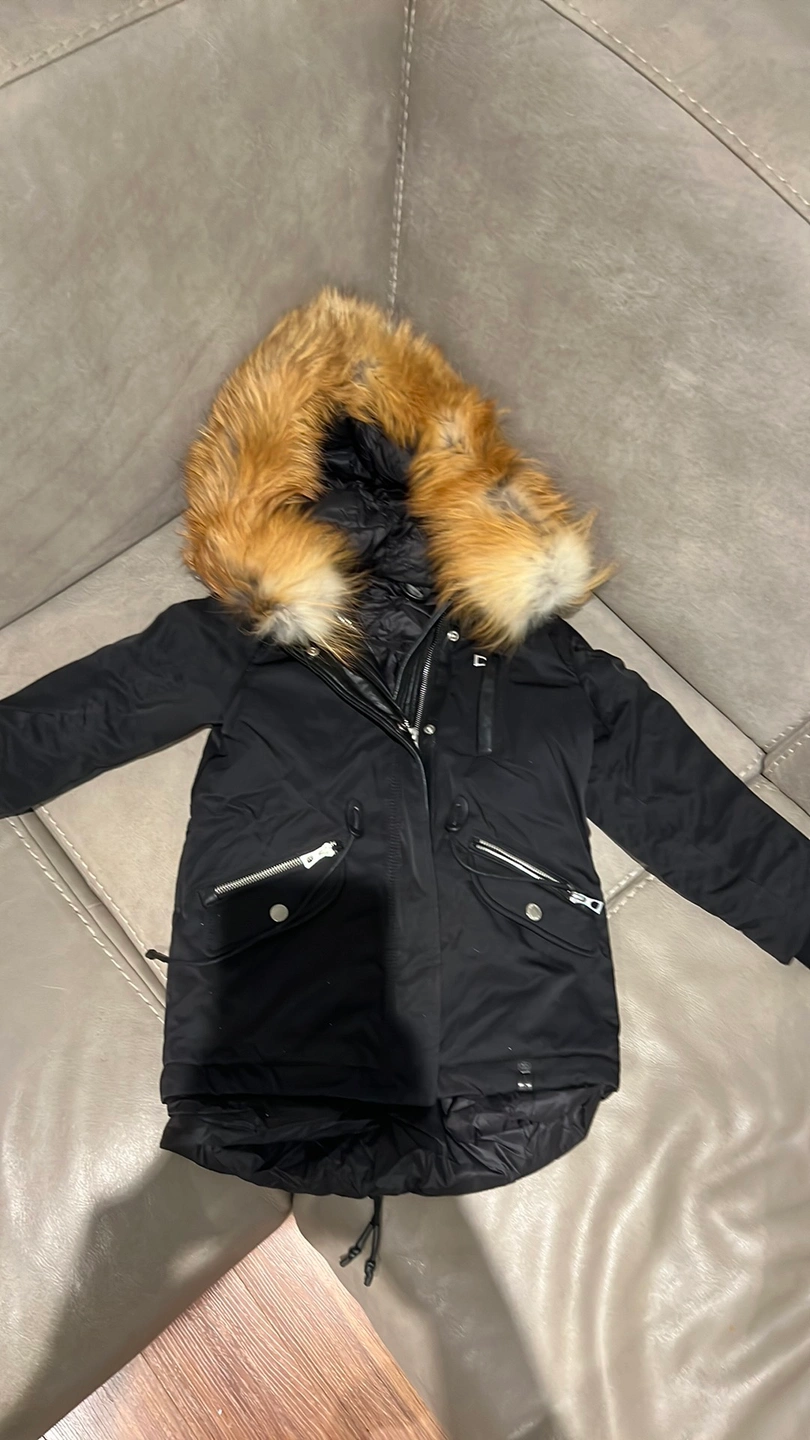 96This is a black winter coat with a fur hood and a zipper closure. It has two pockets on the front and a drawstring waist. The coat is lined with a quilted fabric.