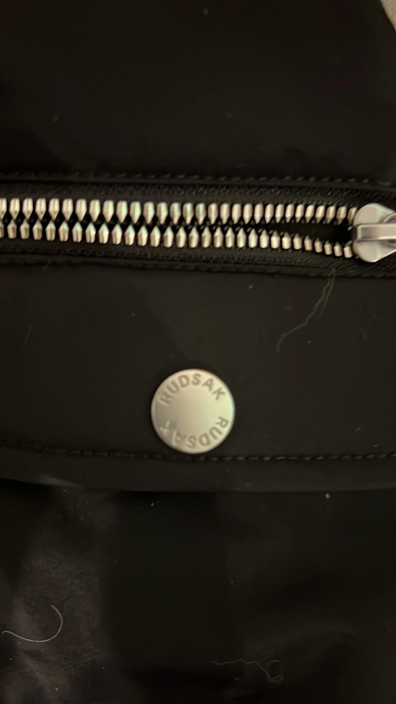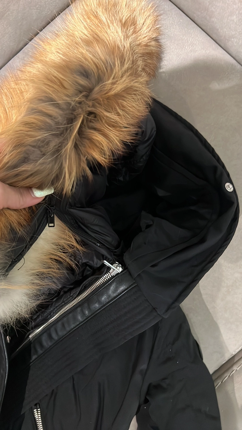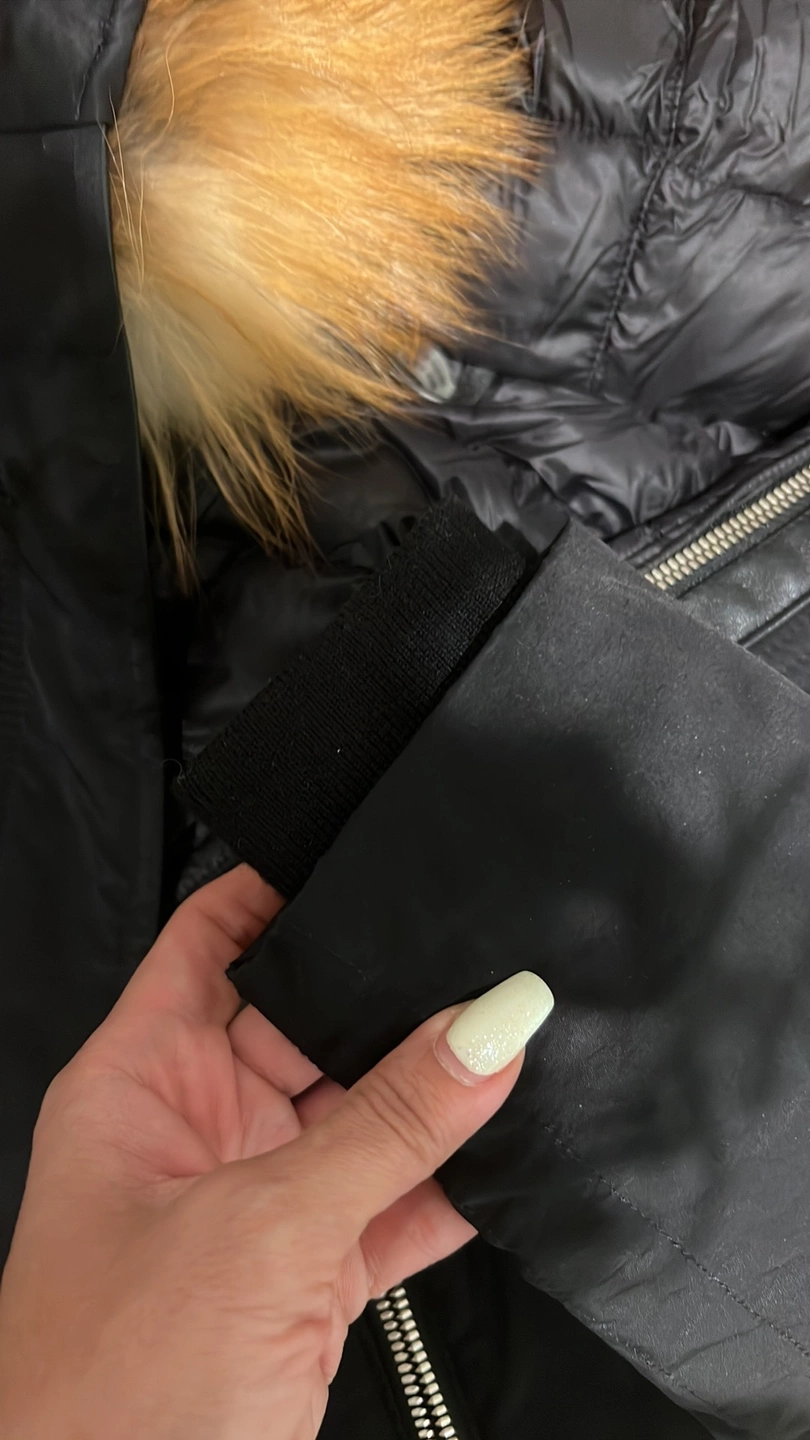 96This is a black winter coat with a fur hood and a zipper closure. It has two pockets on the front and a drawstring waist. The coat is lined with a quilted fabric.