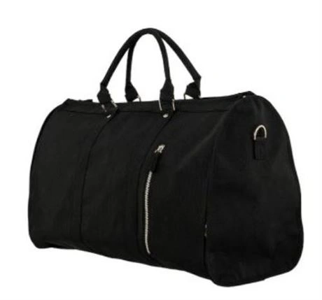 A black travel duffle bag with a zippered pocket on the side and two handles.