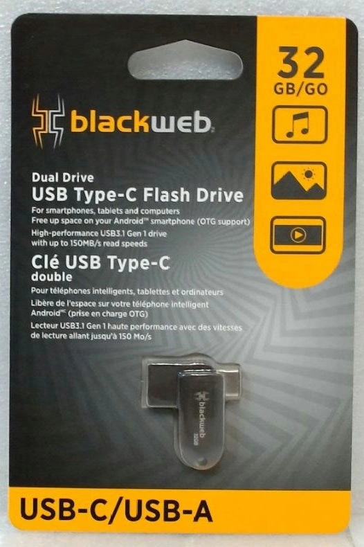 This Blackweb USB Type-C Flash Drive is 32 GB and includes a USB-A connection. It is designed for smartphones, tablets and computers and has high-performance USB3.1 Gen 1 speeds.