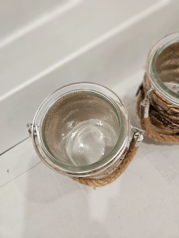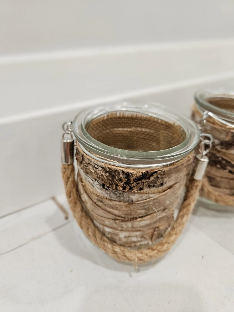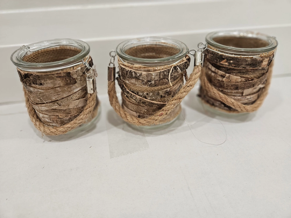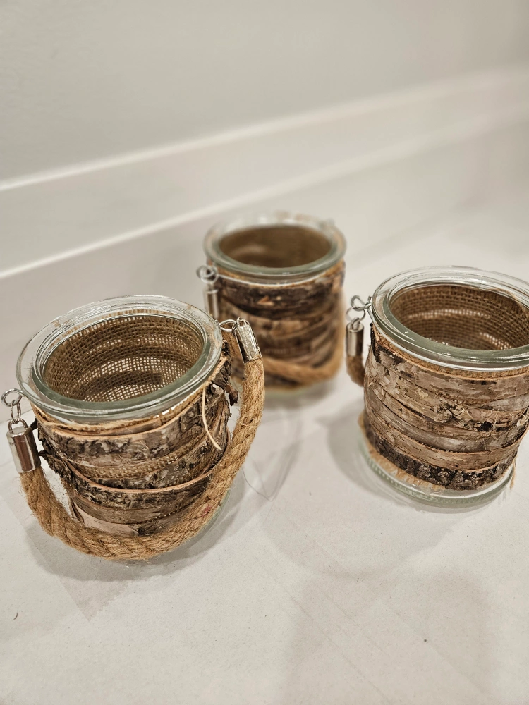 97Three glass candle holders with jute rope handles and birch bark detailing. Glass vase cover with wood Handle attached Brand new 4 inch tall 3.5 inch top Check my other ad more decor