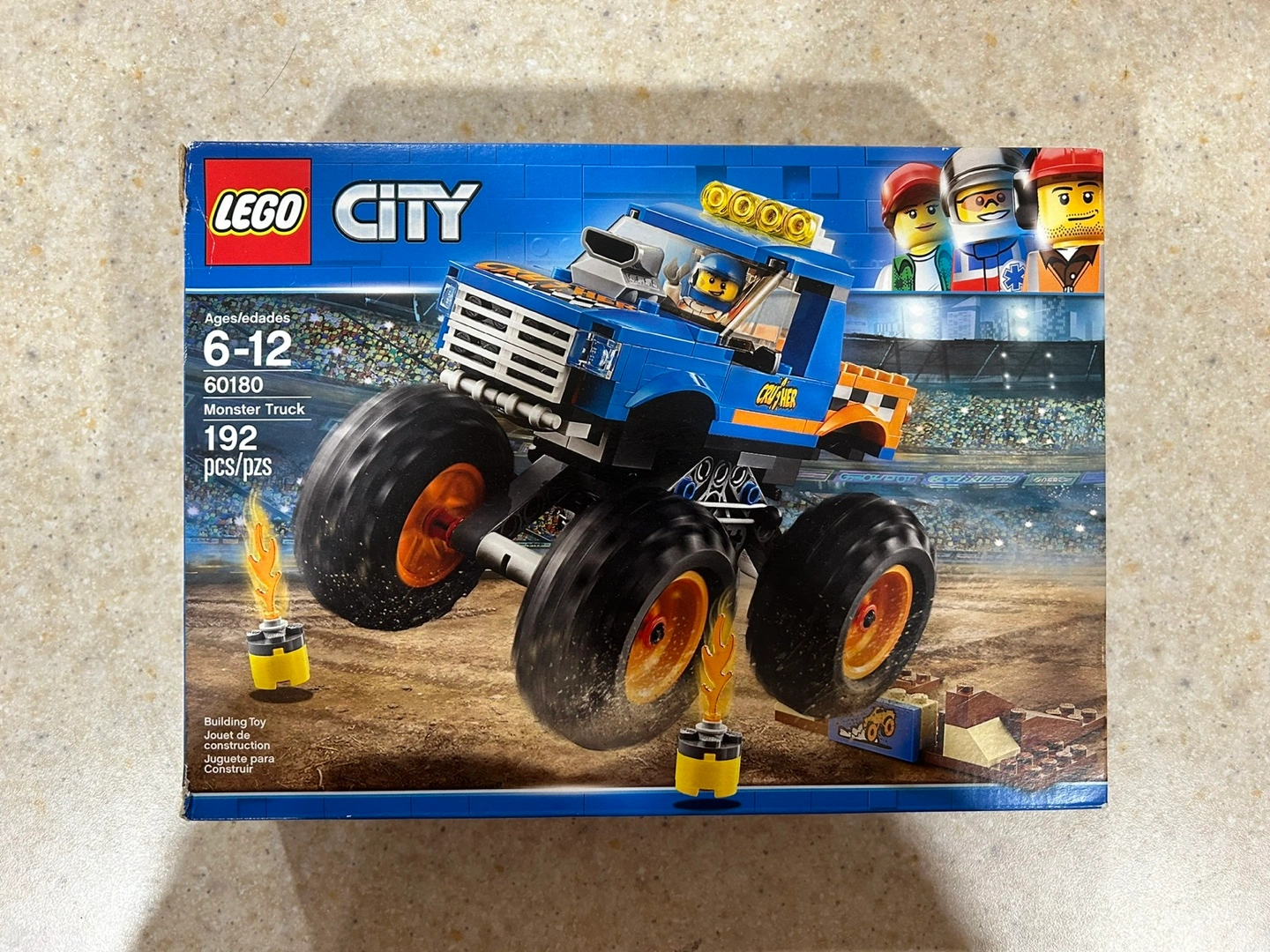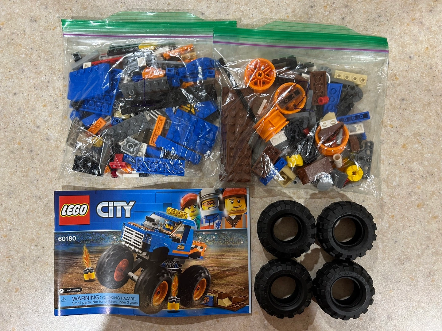 LEGO City 60180 Monster Truck. Item comes in original box, previously assembled but repackaged. Has all pieces and instructions. Comes with four extra tires.