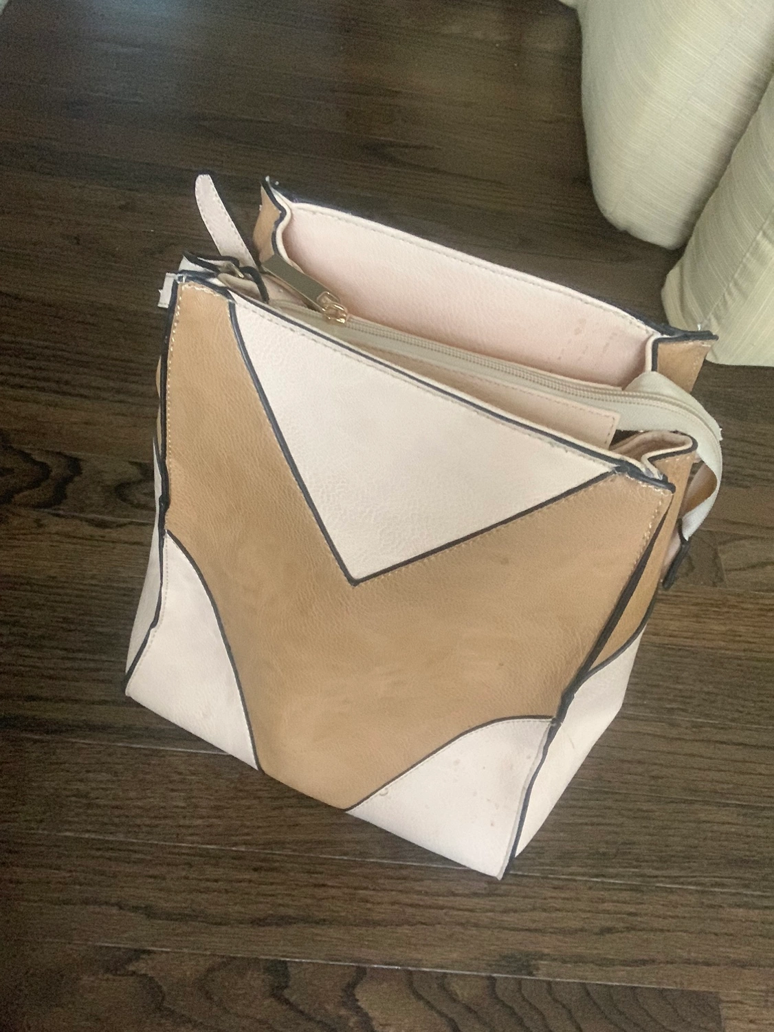 109This is a tan and white handbag with black accents . You can adjust the size of bag by zipping or unzipping the sides . It also has a long strap. It has a pocket on the inside and the inside lining has a black and white bird pattern.