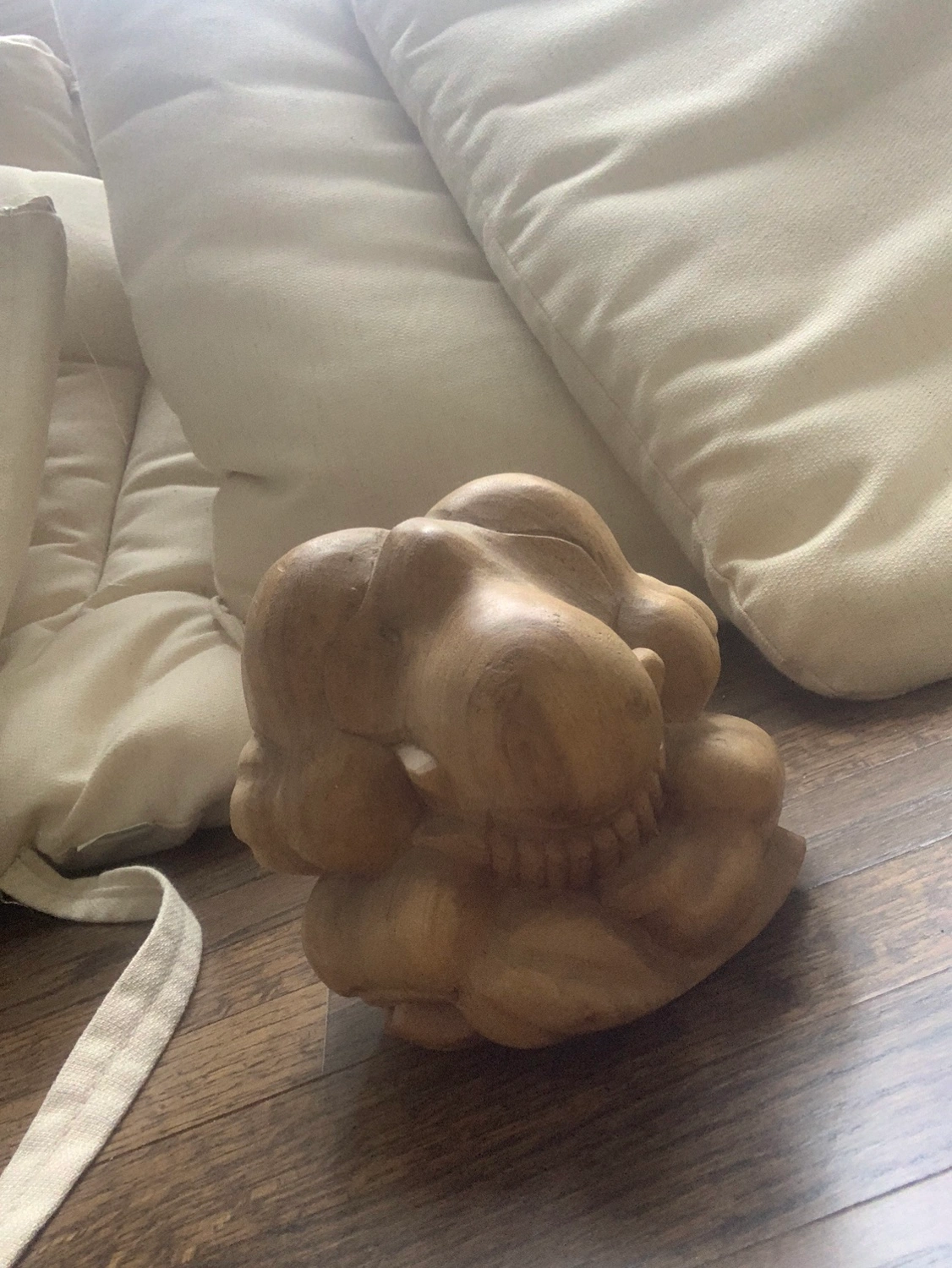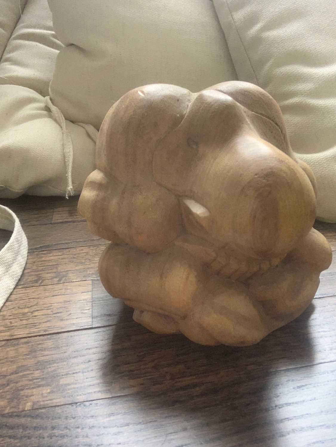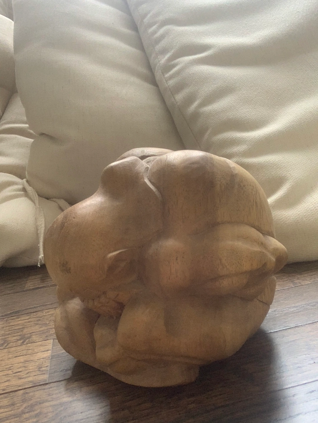 109Hand-carved wooden sculpture. Man sitting cross legged with his face in his hands.