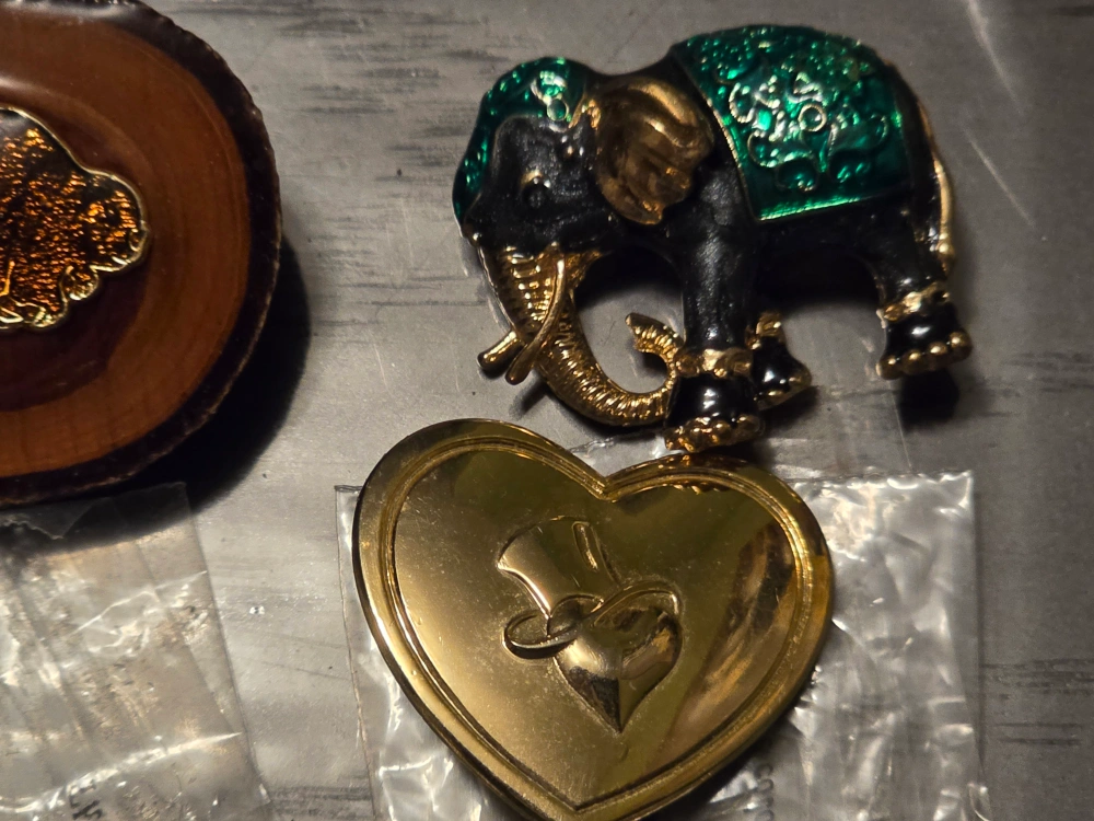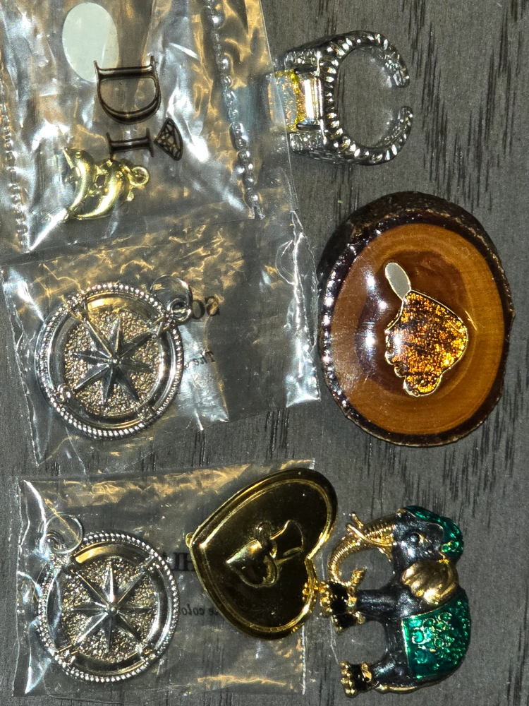 This listing is for five charms and a ring. The charms are two compasses, a beaver, an elephant, a dolphin and a heart with a top hat. The ring features a red stone.