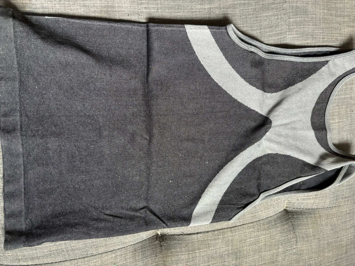A black and grey seamless tank top. It is made from a soft and stretchy material. It has a v-neck and a racerback design. It is great for working out or under shirt for added confidence, gynomastica, flattens chests and stomach adds confidence or after surgery BNIB neve used