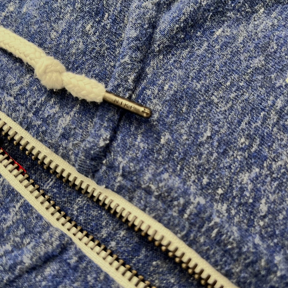 Blue and white zip up hoodie with a white Nike logo and drawstrings. The hoodie has a front pocket.