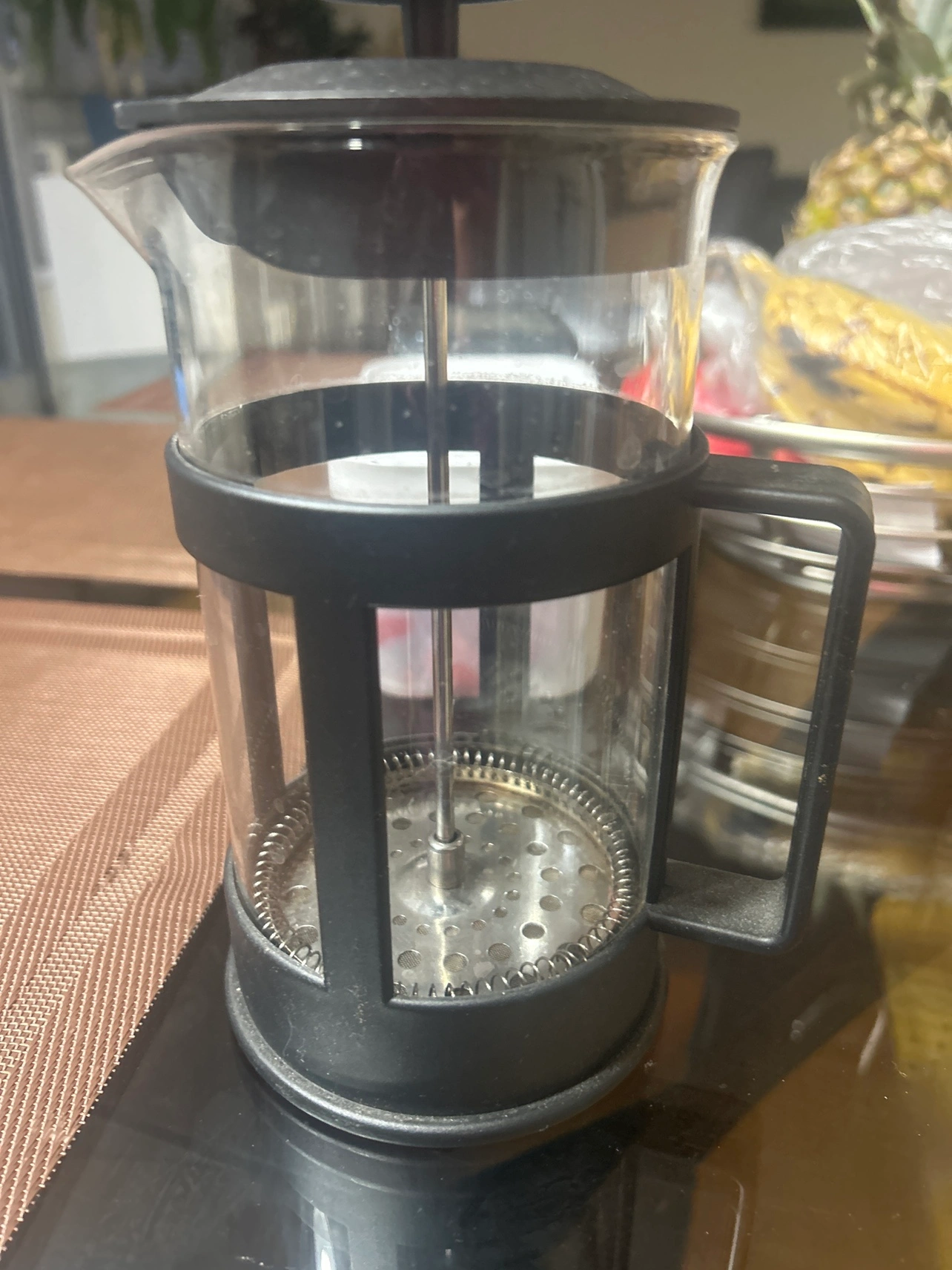 This is a French press coffee maker. It is made of glass and black plastic. It is in good condition.