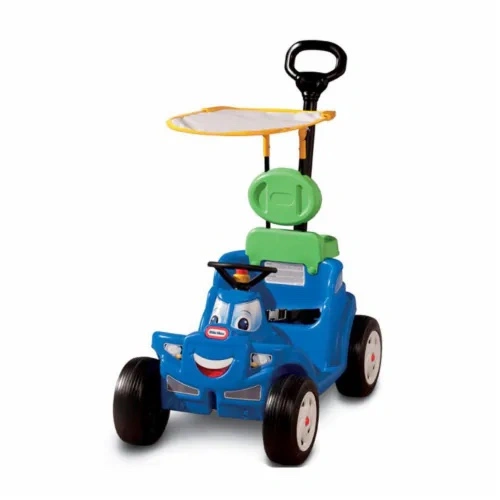 This is a Little Tikes Push & Ride Car. It features a handle for pushing and a canopy for shade. It has a steering wheel and a fun face on the front. The car is blue and green. However the tires ares slightly sanded down