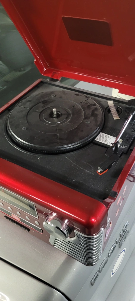 This red record player plays vinyl records, CDs, and radio. It includes many functions including a Bluetooth feature.